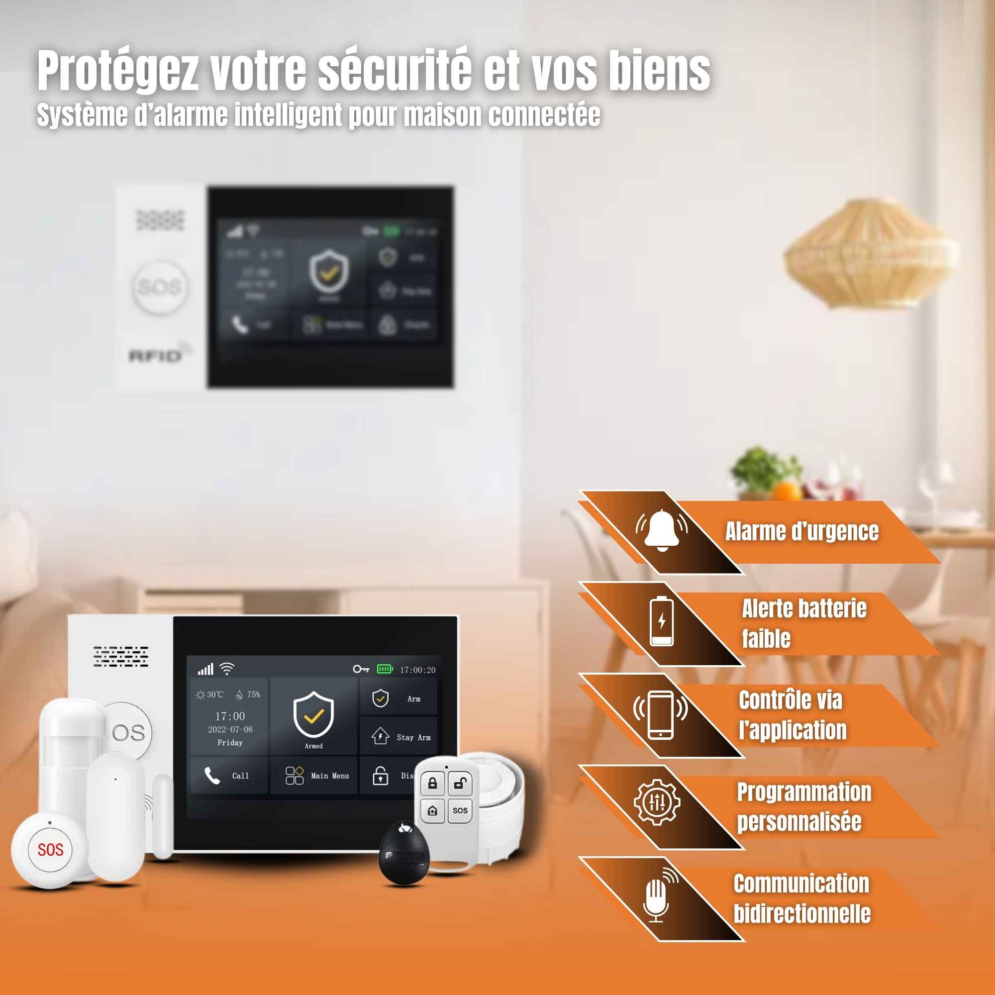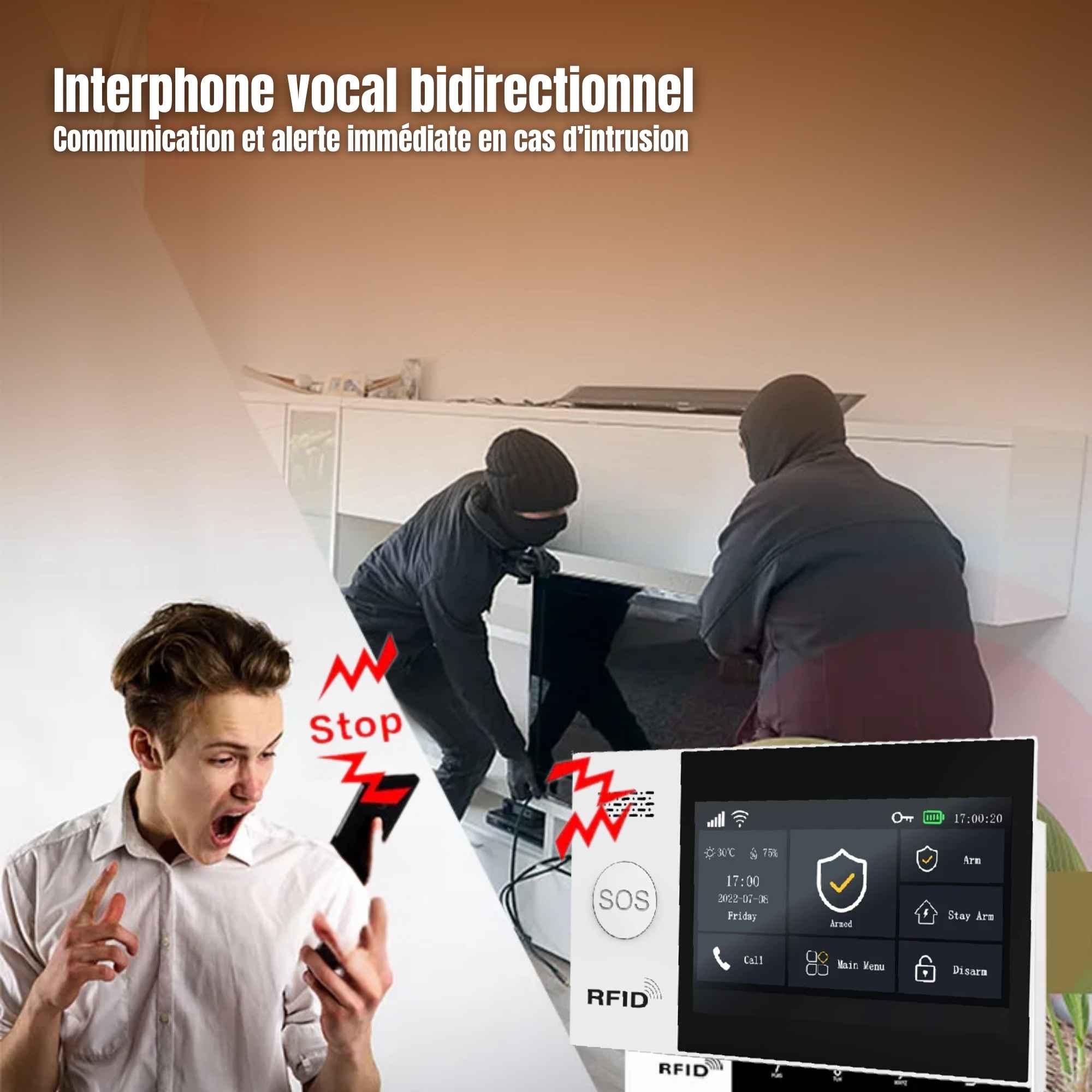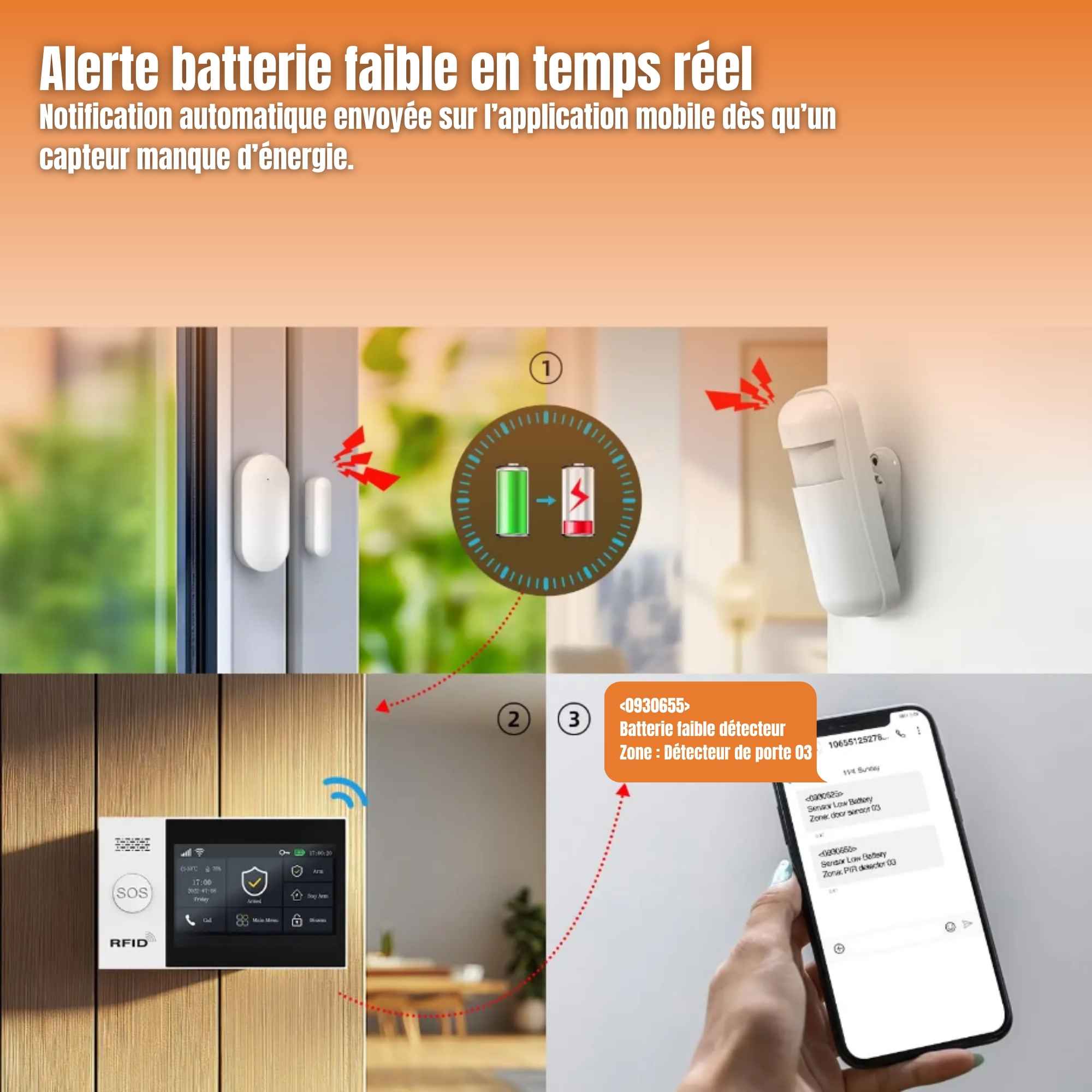 Le système est compatible avec les cartes SIM 2G, 3G et 4G. Cela permet l'envoi d'alertes par SMS et appels vocaux en complément des notifications par internet.