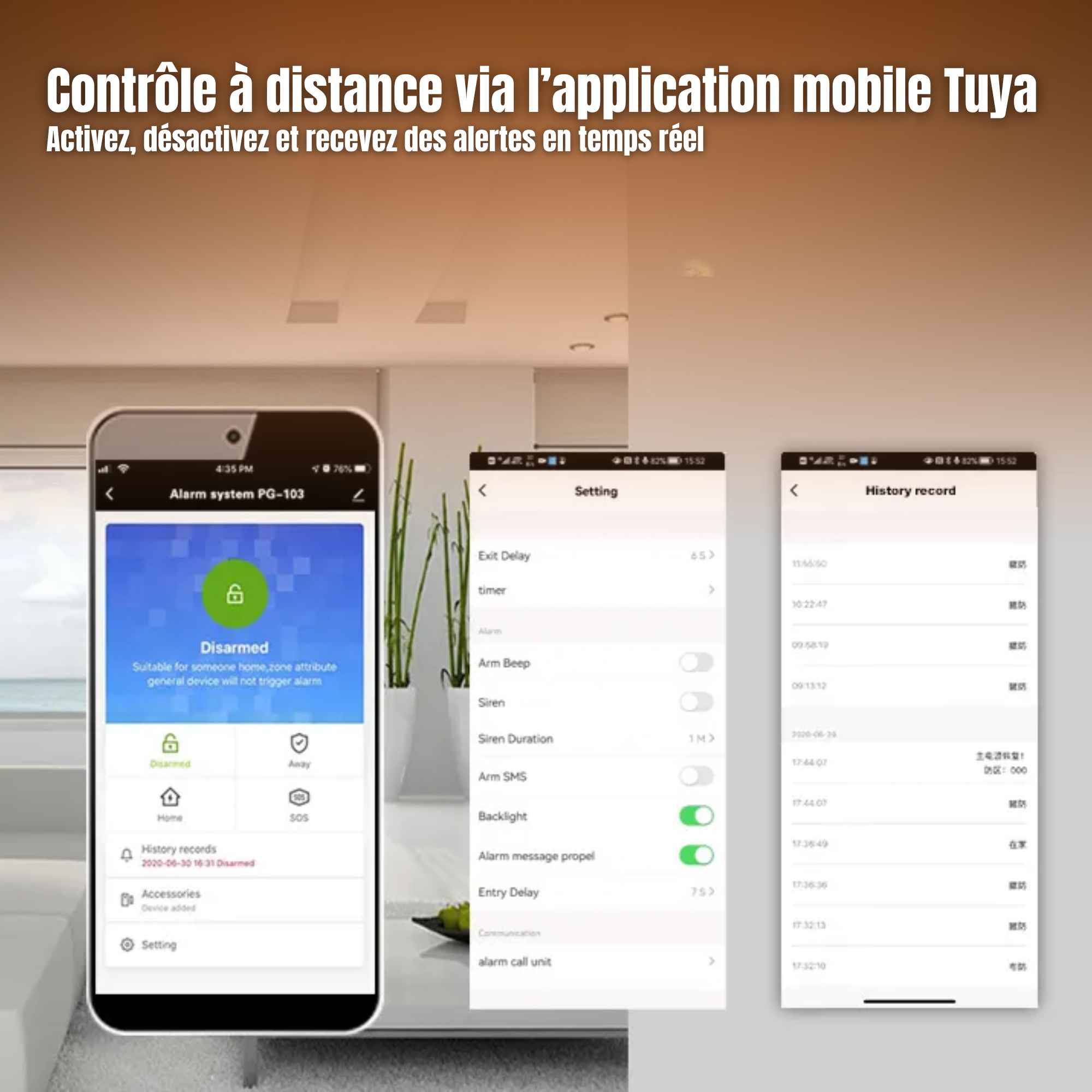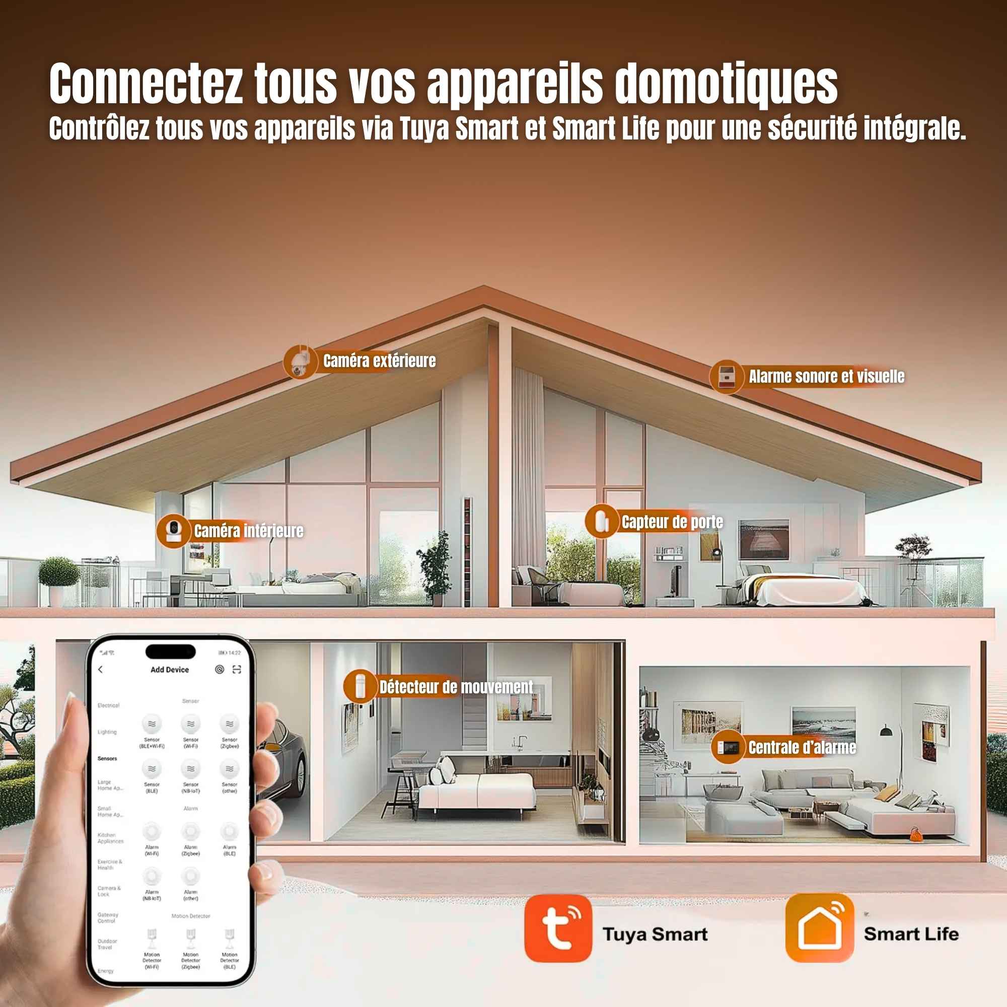 Compatibilité logicielle avec les écosystèmes Tuya Smart et Smart Life. Permet la gestion centralisée des caméras, des capteurs et de l’unité d’alarme via une interface réseau unique.