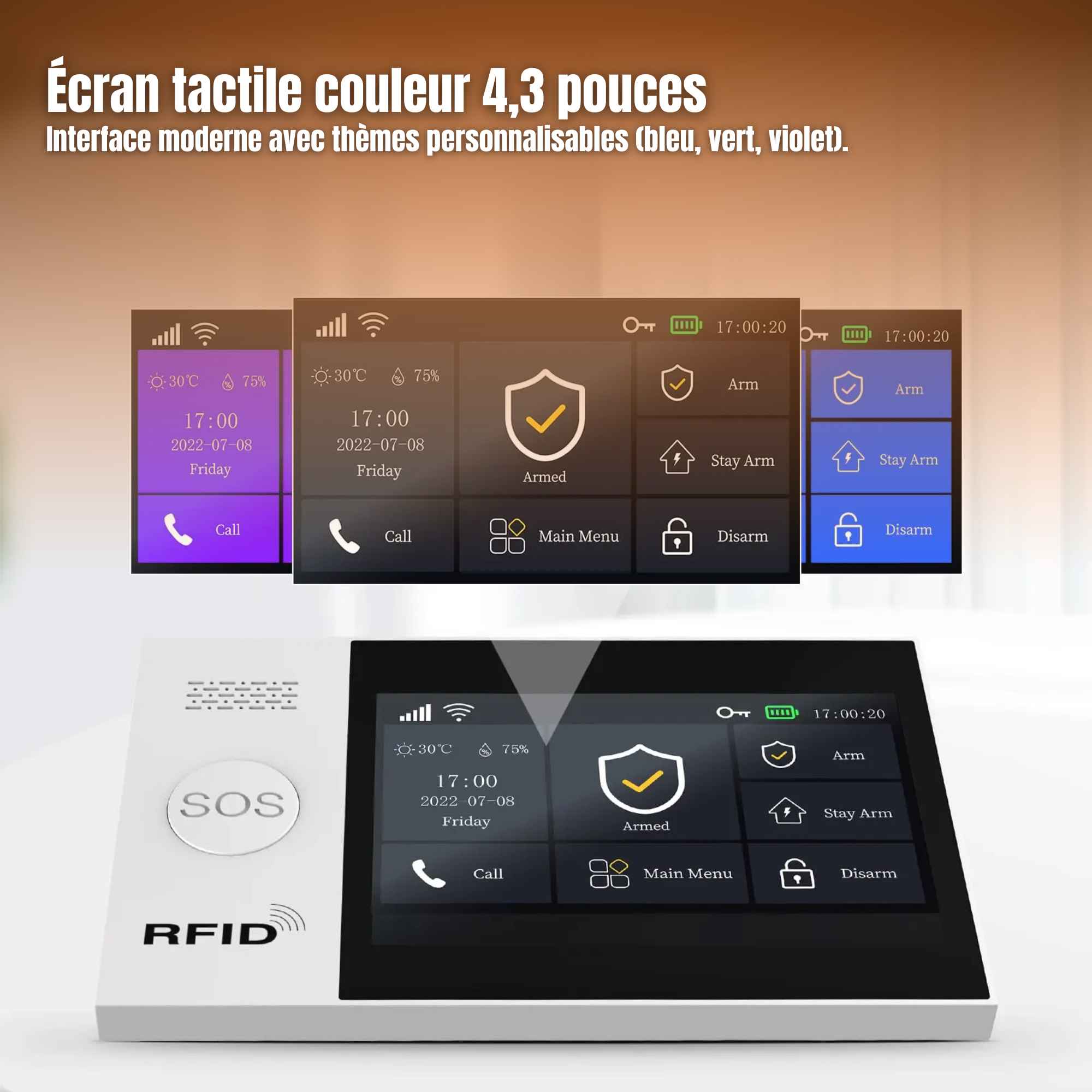 L'unité centrale est équipée d'un écran tactile IPS couleur de 4,3 pouces, offrant une interface intuitive et un large angle de vision pour une gestion facilitée.