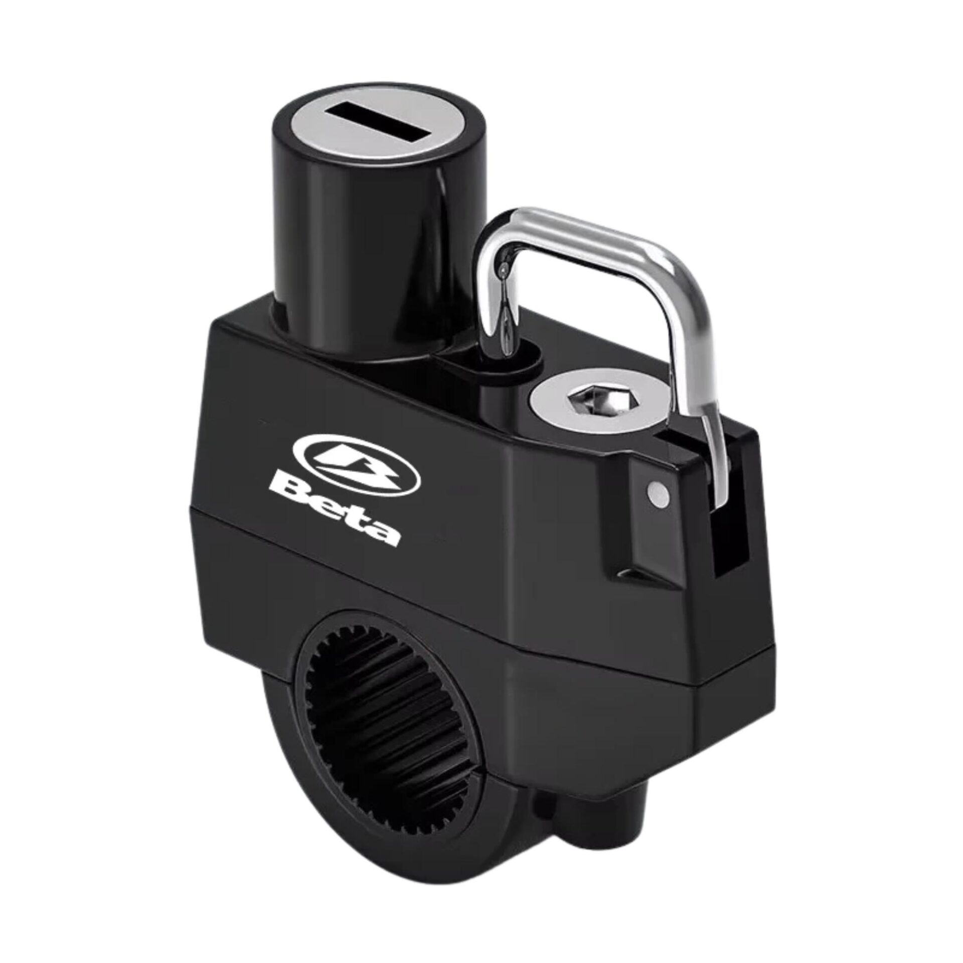 Dispositif de verrouillage compact avec mécanisme à clé, conçu pour l’ancrage des équipements de protection individuelle sur véhicules motorisés.