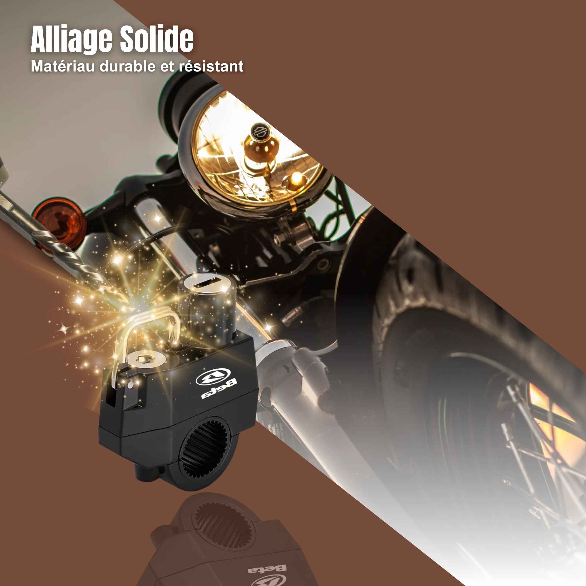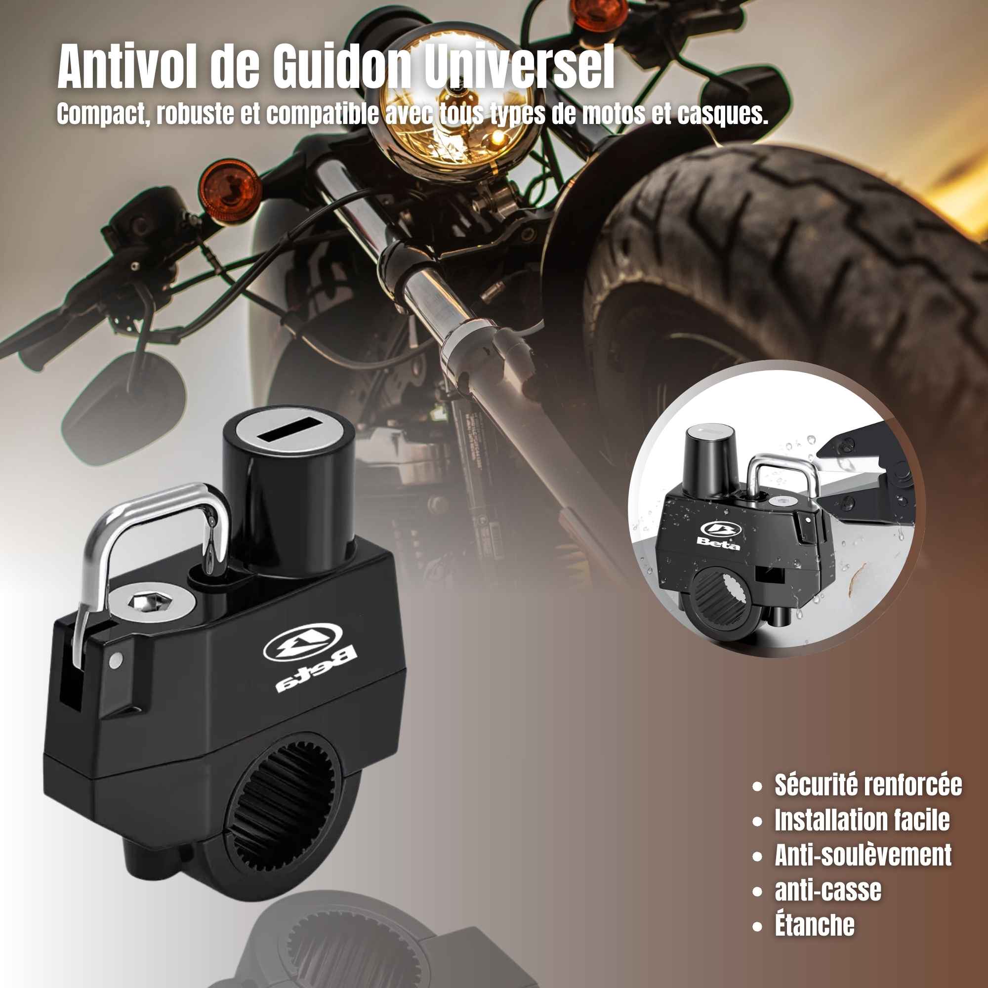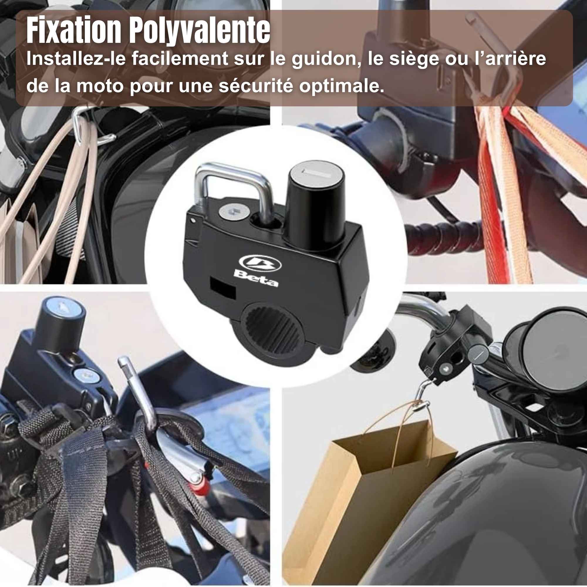 Ce dispositif présente une conception universelle compatible avec les motocycles, cycles et trottinettes équipés de guidons ou de structures tubulaires d'un diamètre compris entre 20 et 28 mm.