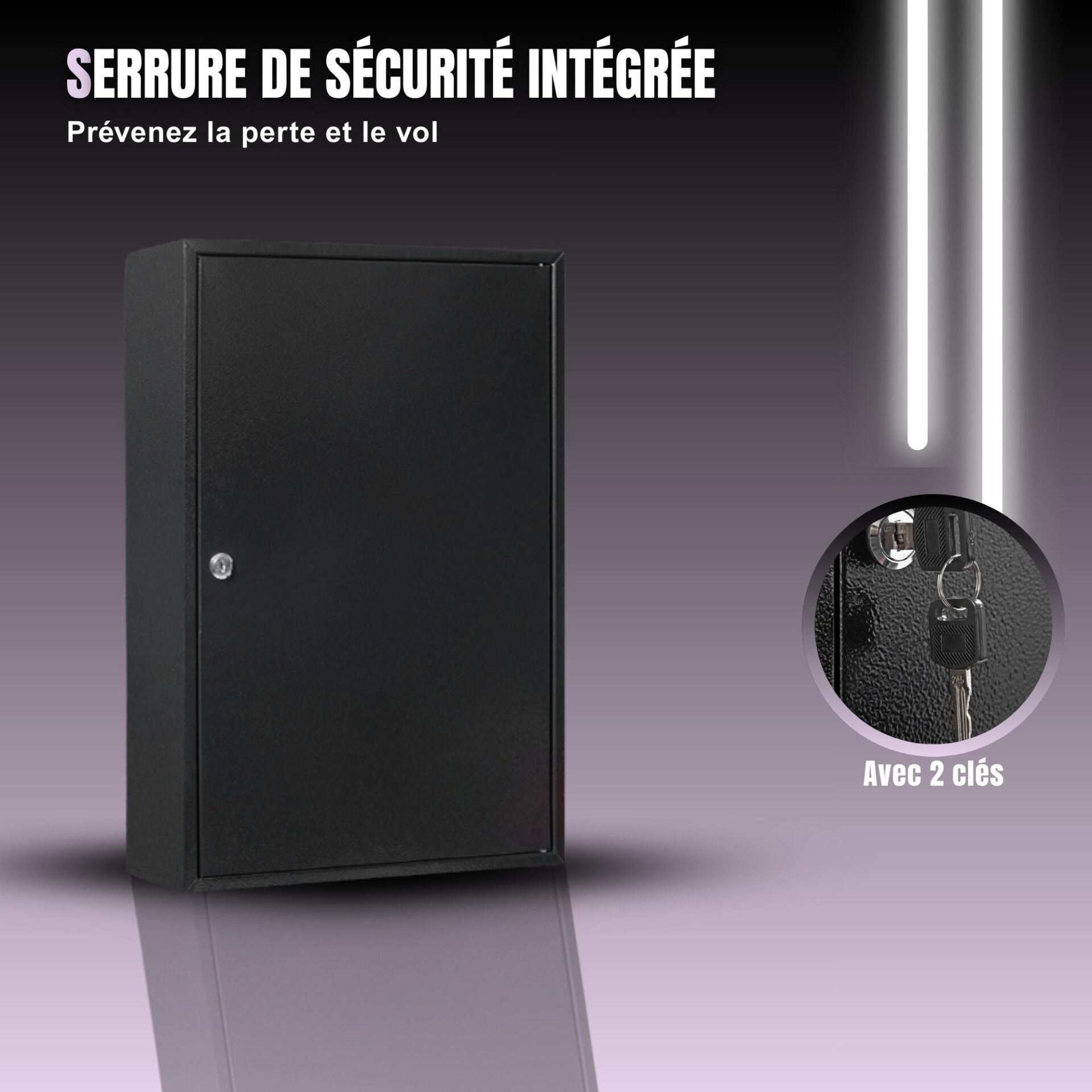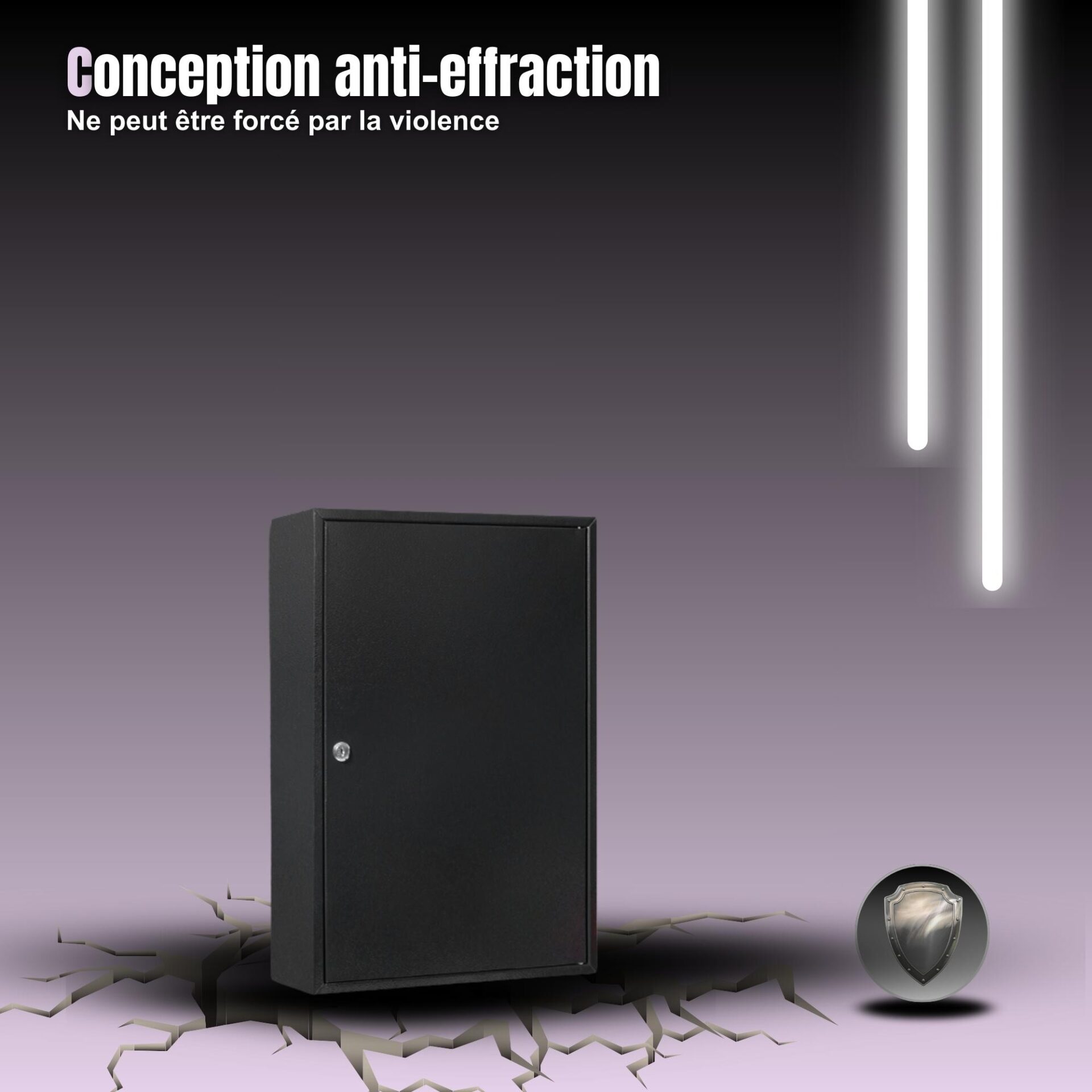 Le système de condamnation varie selon la capacité : l'unité de 48 positions utilise une serrure mécanique à combinaison numérique de 3 chiffres, tandis que les versions de 100 et 200 positions sont équipées d'une serrure à barillet pour clé physique.