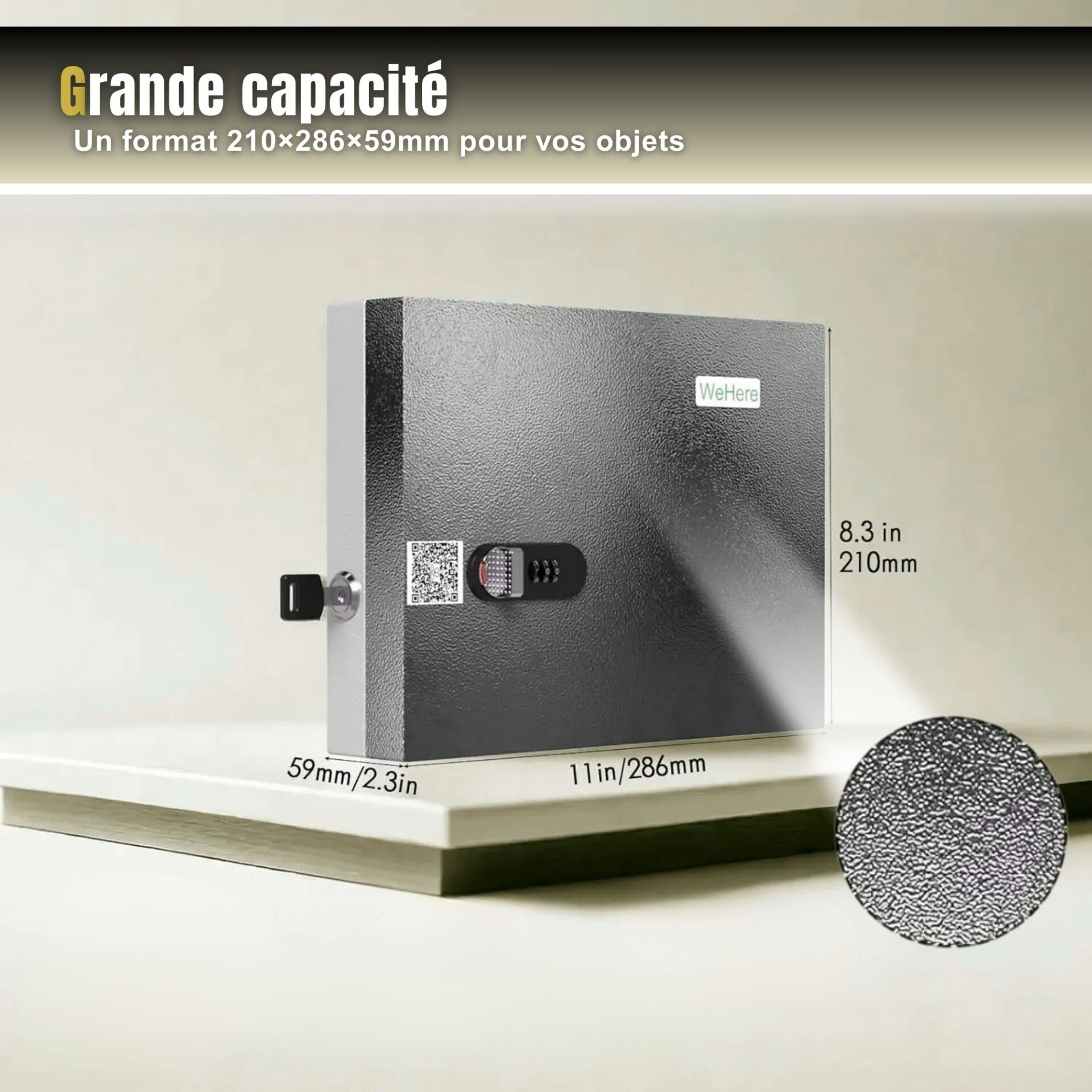 Ce dispositif offre une double interface d'accès : un verrouillage par combinaison numérique manuelle et une serrure mécanique à barillet pour un accès physique de secours.