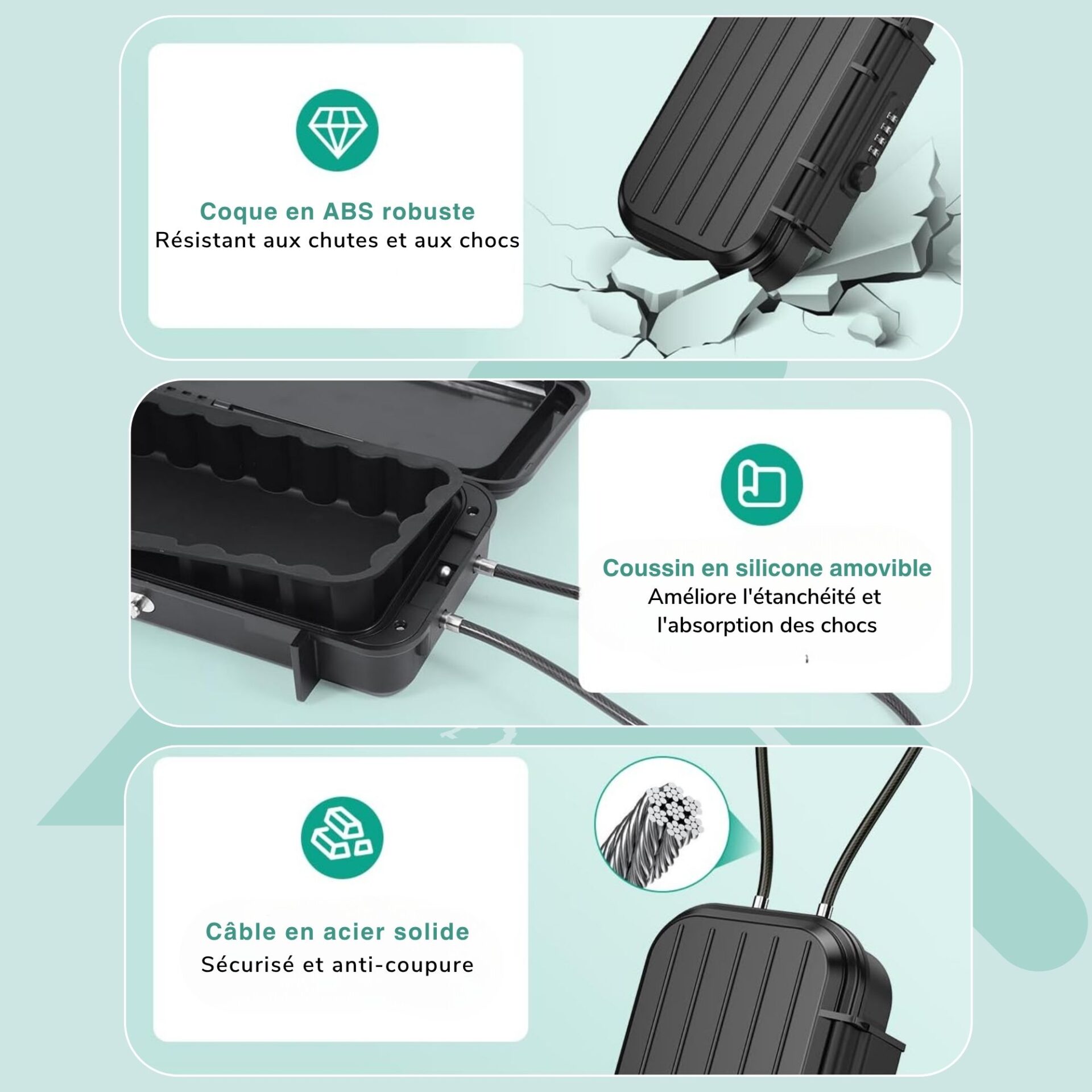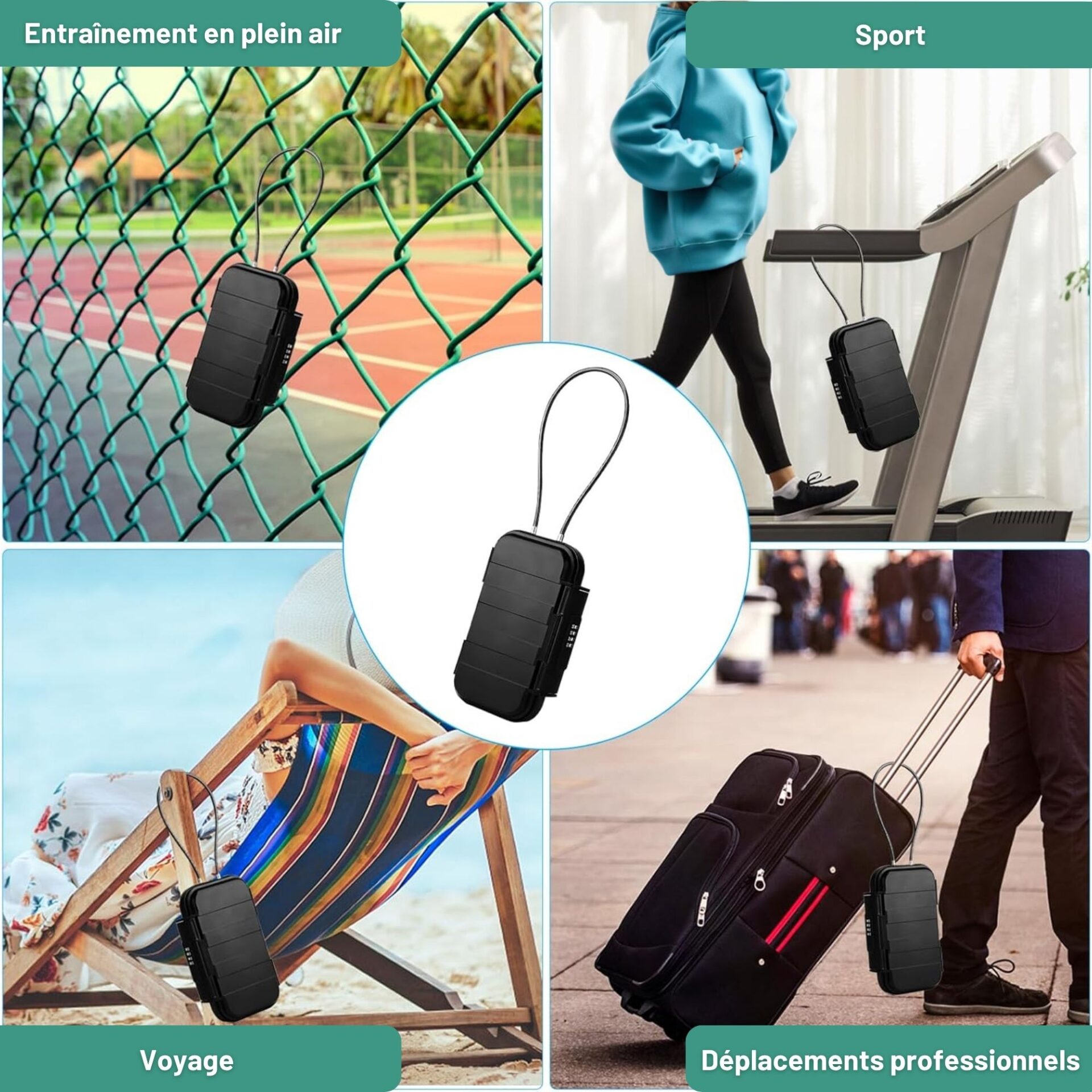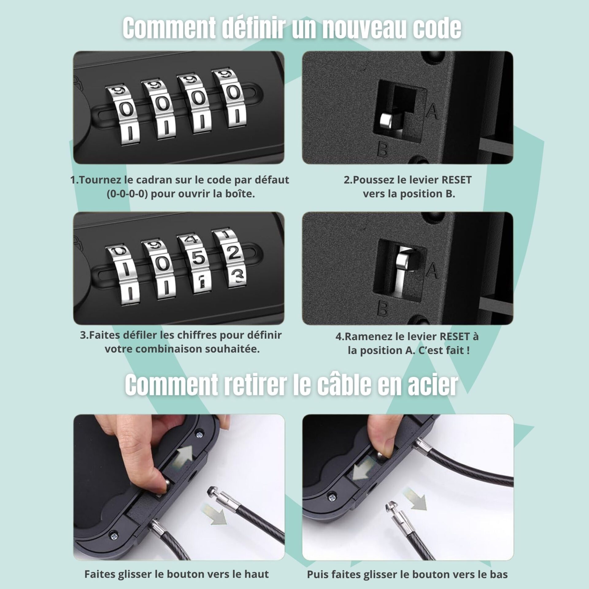 Définissez votre code de sécurité unique et utilisez le câble en acier amovible pour une fixation rapide et pratique.