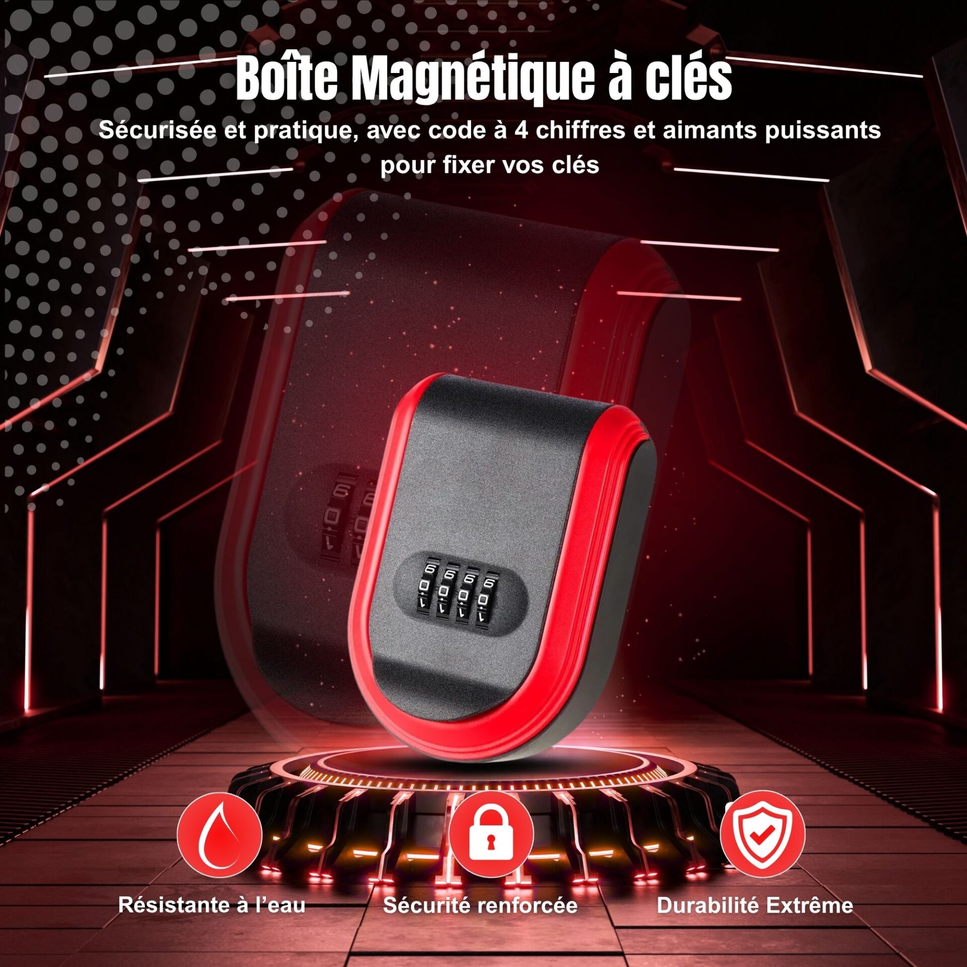 Équipé d’aimants à haute performance, ce boîtier se fixe solidement sur toute structure ferreuse, offrant une solution de secours accessible en cas de besoin.