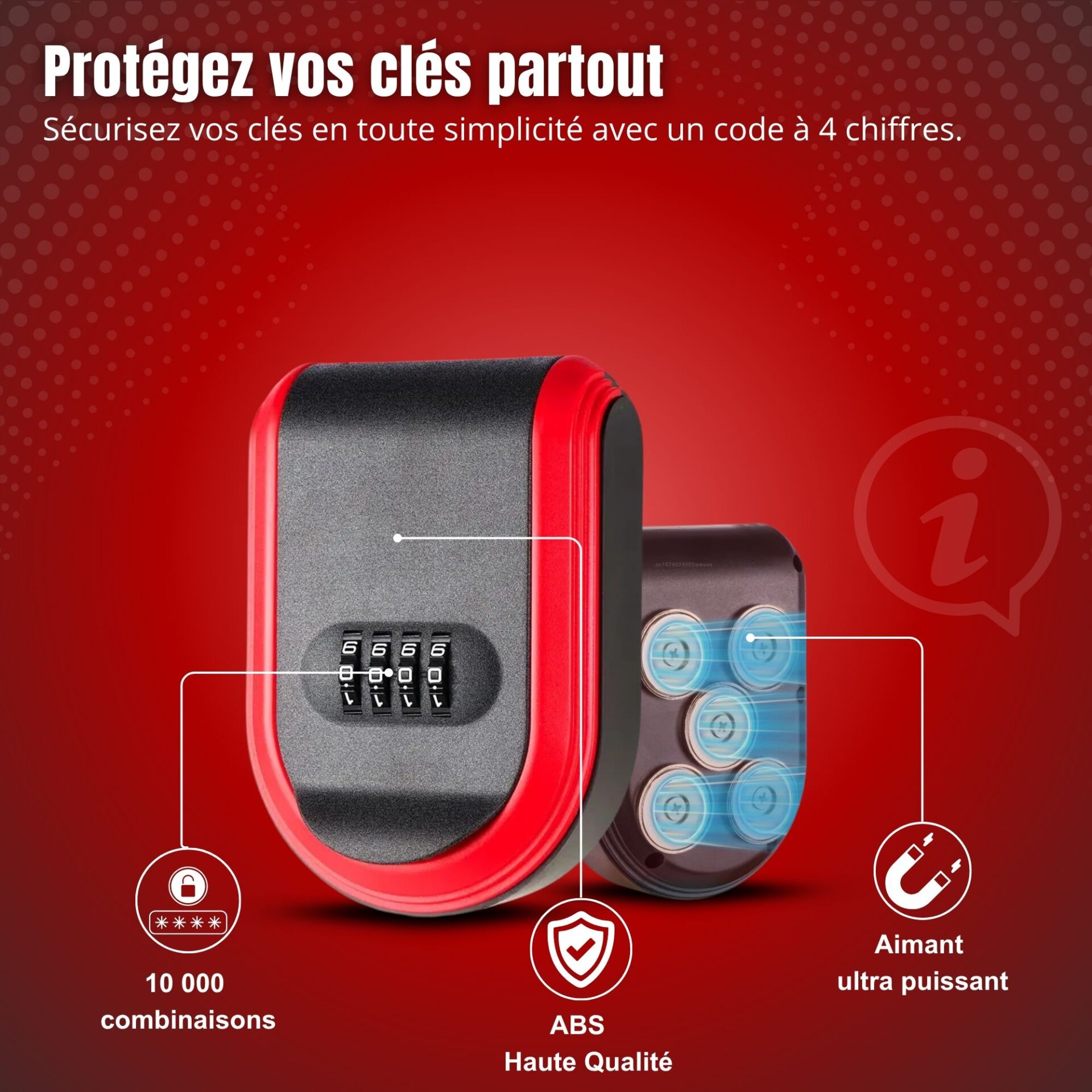 Une solution pratique et fiable dotée d’un mécanisme à 4 chiffres et d’aimants intégrés pour organiser vos clés de secours sur tout support métallique.