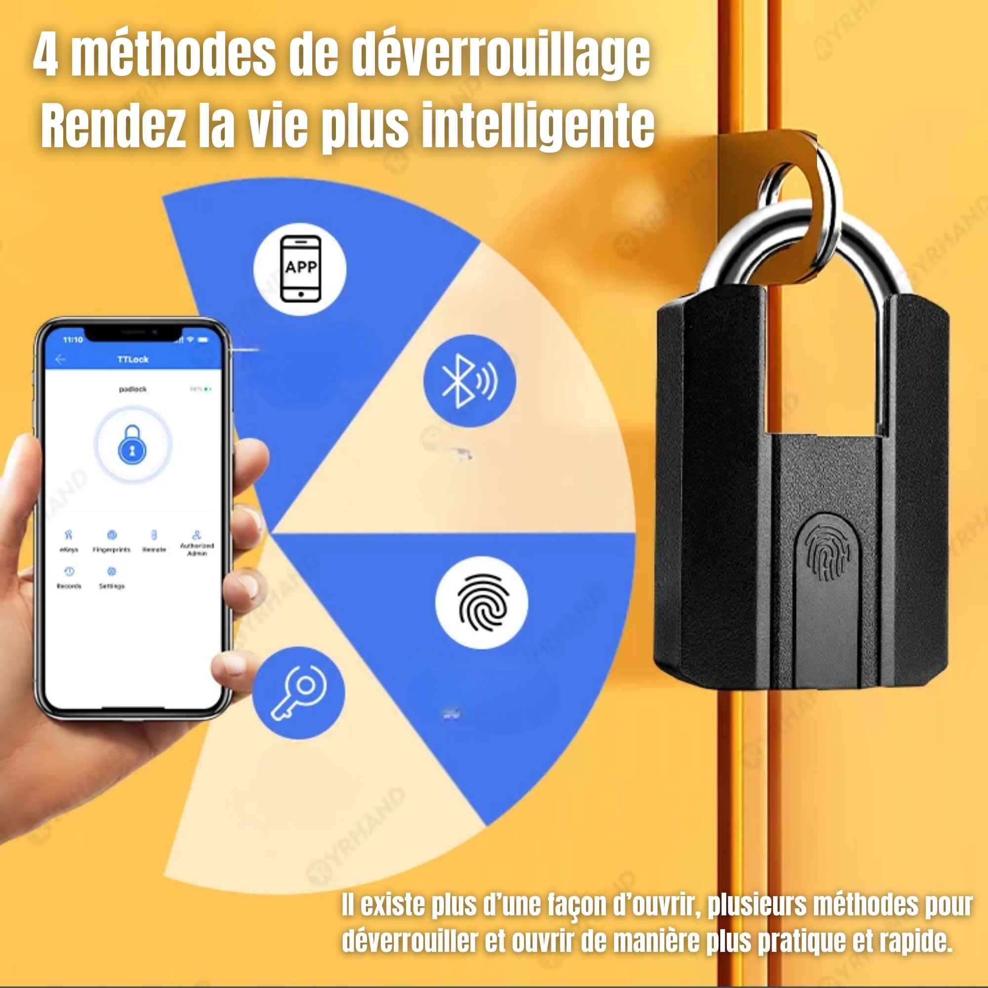 L'accès peut s'effectuer par reconnaissance d'empreinte digitale, par clé mécanique physique ou via l'application mobile (Wi-Fi).