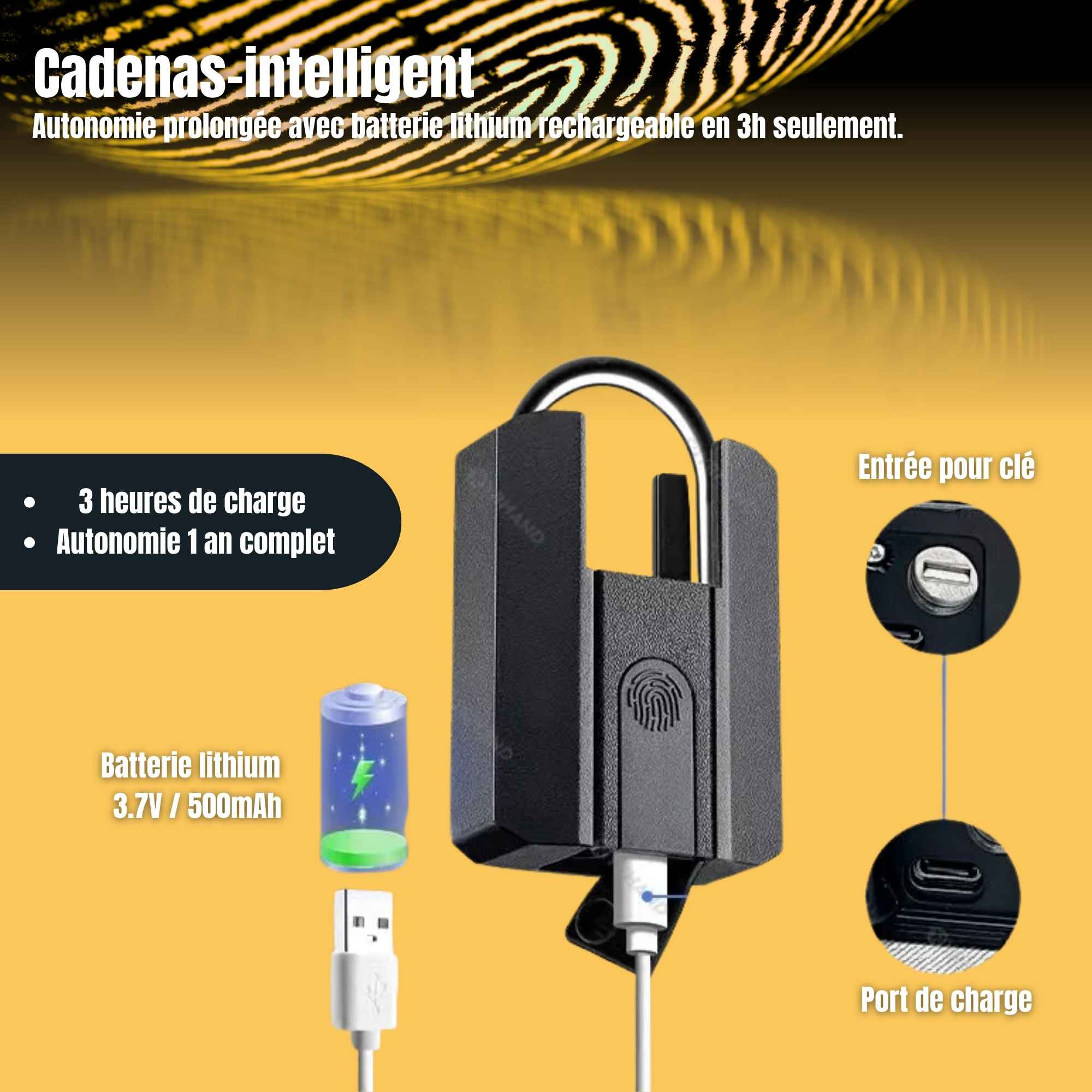 En cas d'épuisement de la batterie, le cadenas peut être ouvert à l'aide de la clé mécanique de secours avant d'être mis en charge.