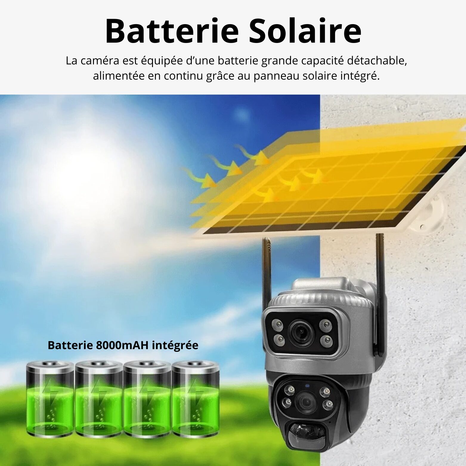 La batterie intégrée de 8000 mAh emmagasine l'énergie durant la journée via le panneau solaire pour assurer un fonctionnement continu durant la nuit ou lors de périodes nuageuses.