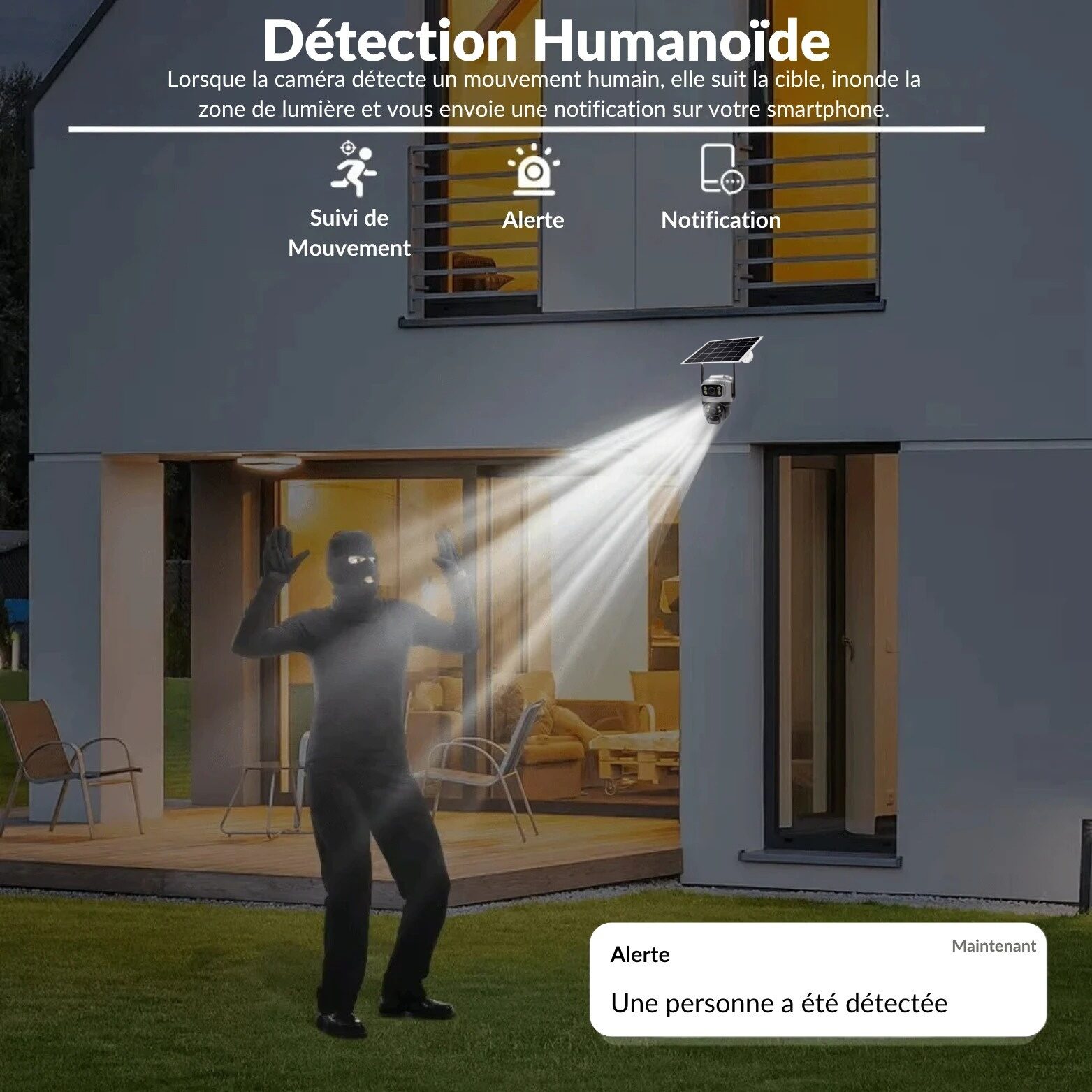 Ce système d’analyse d’image identifie les formes humaines en mouvement. Lors d’une détection, le dispositif active un éclairage de zone, engage un suivi directionnel automatique de la cible grâce à sa motorisation et transmet une notification instantanée vers le terminal mobile associé.