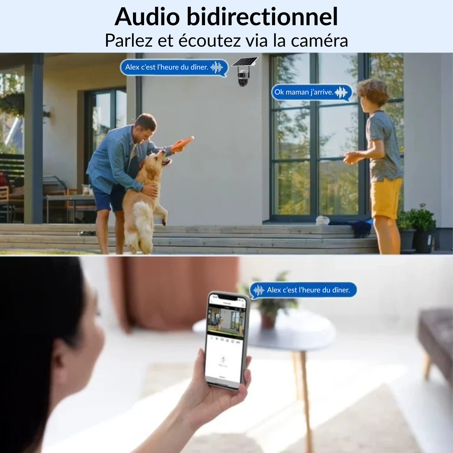 L’appareil intègre un microphone et un haut-parleur pour permettre une communication audio en direct. Cette fonction facilite les échanges vocaux à distance entre l’utilisateur, via l’application de gestion, et les personnes situées à proximité du dispositif de surveillance.