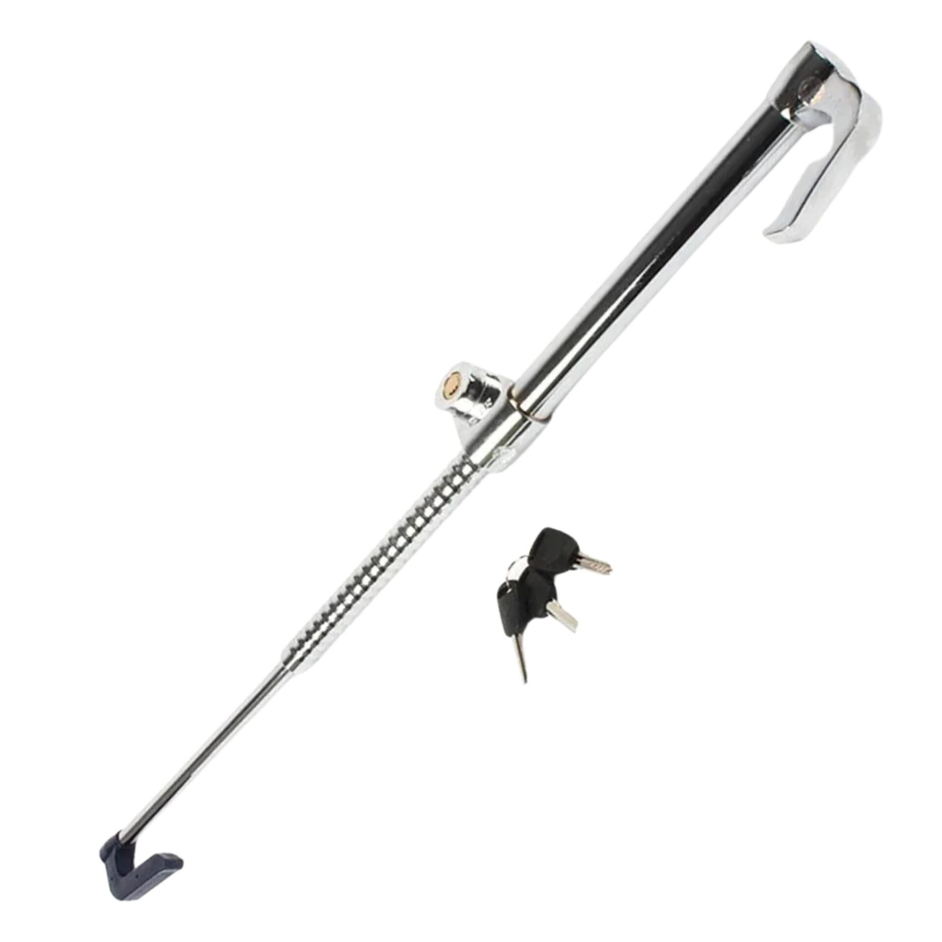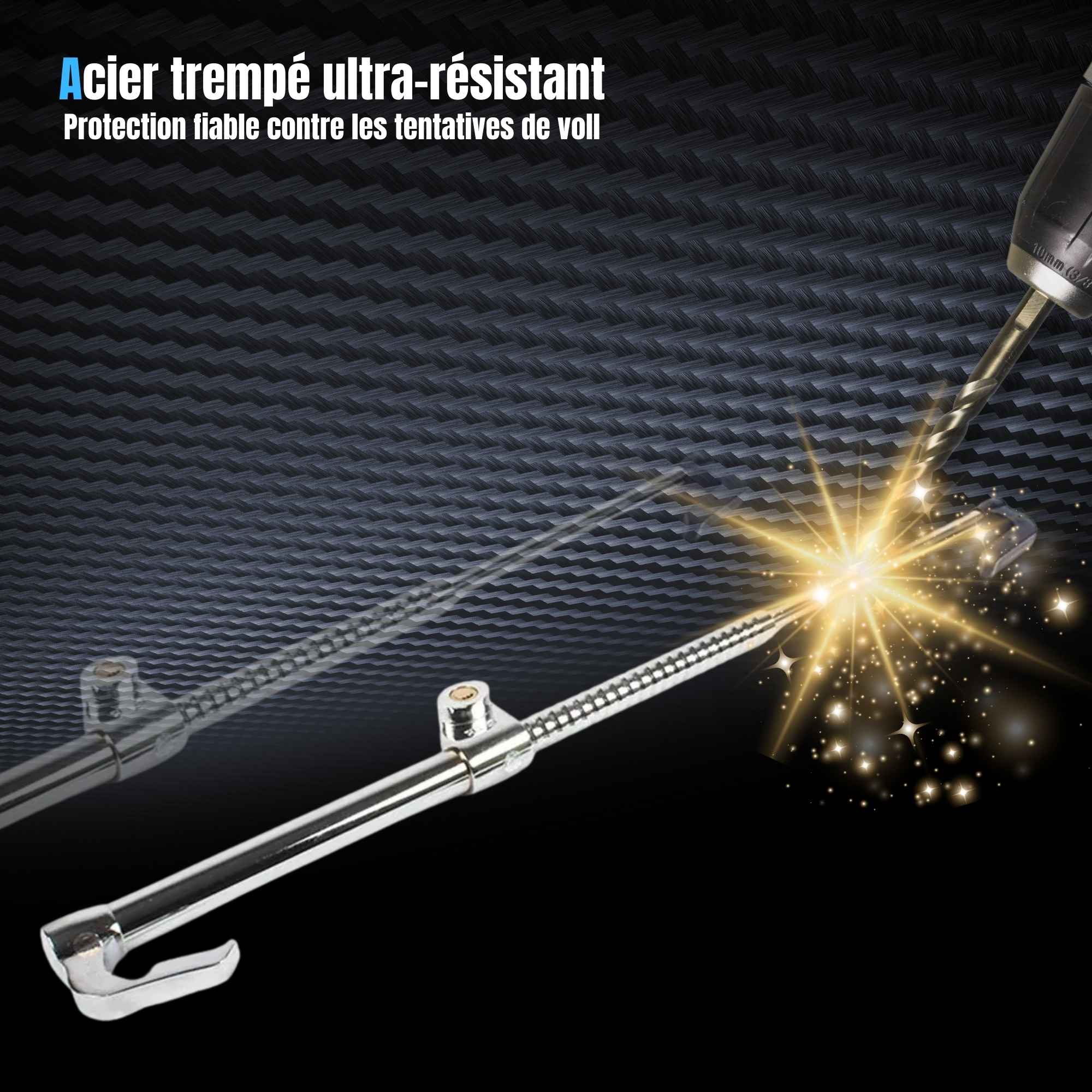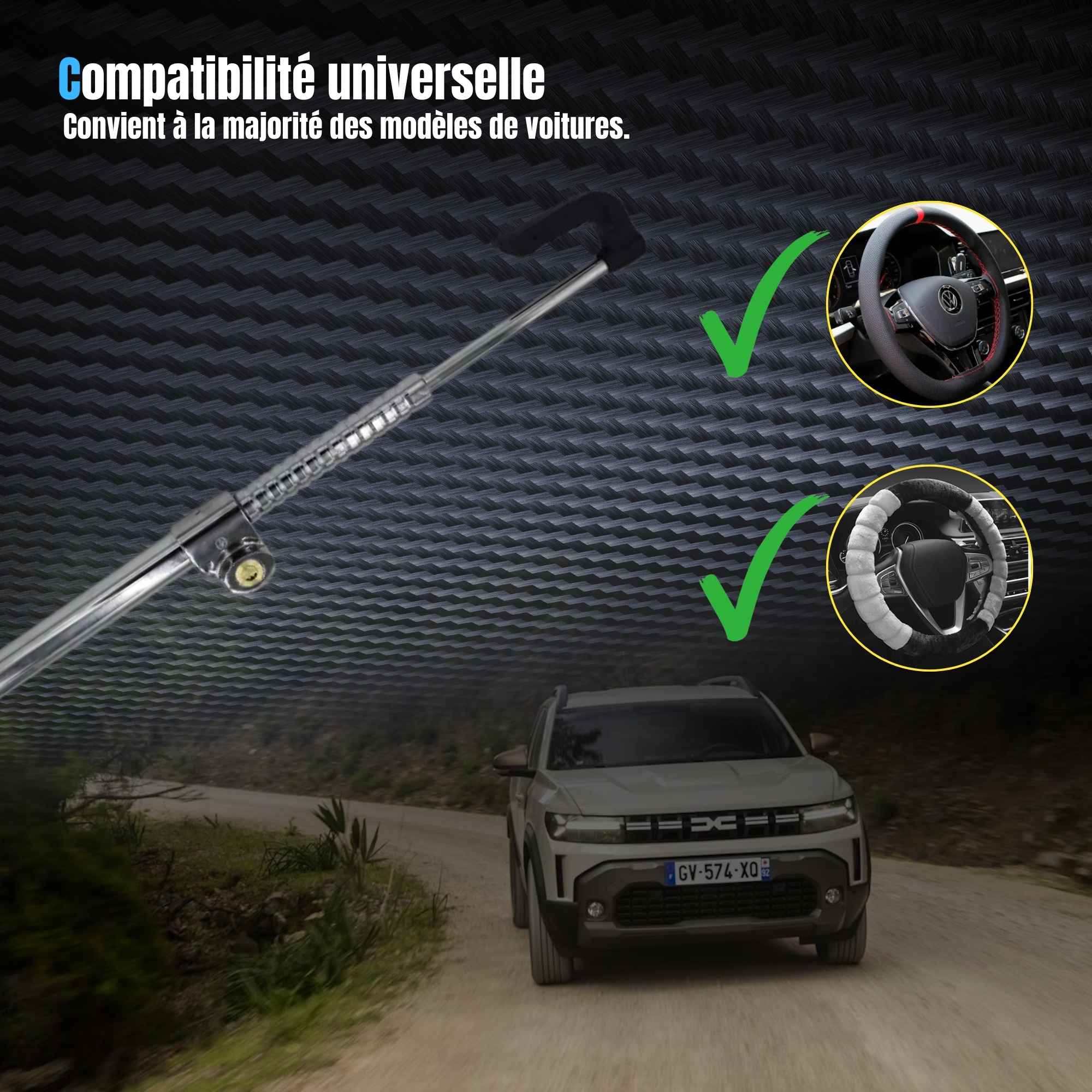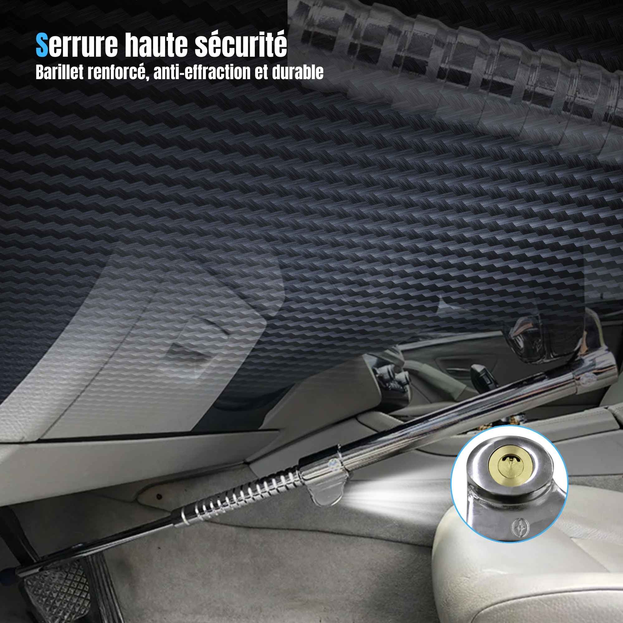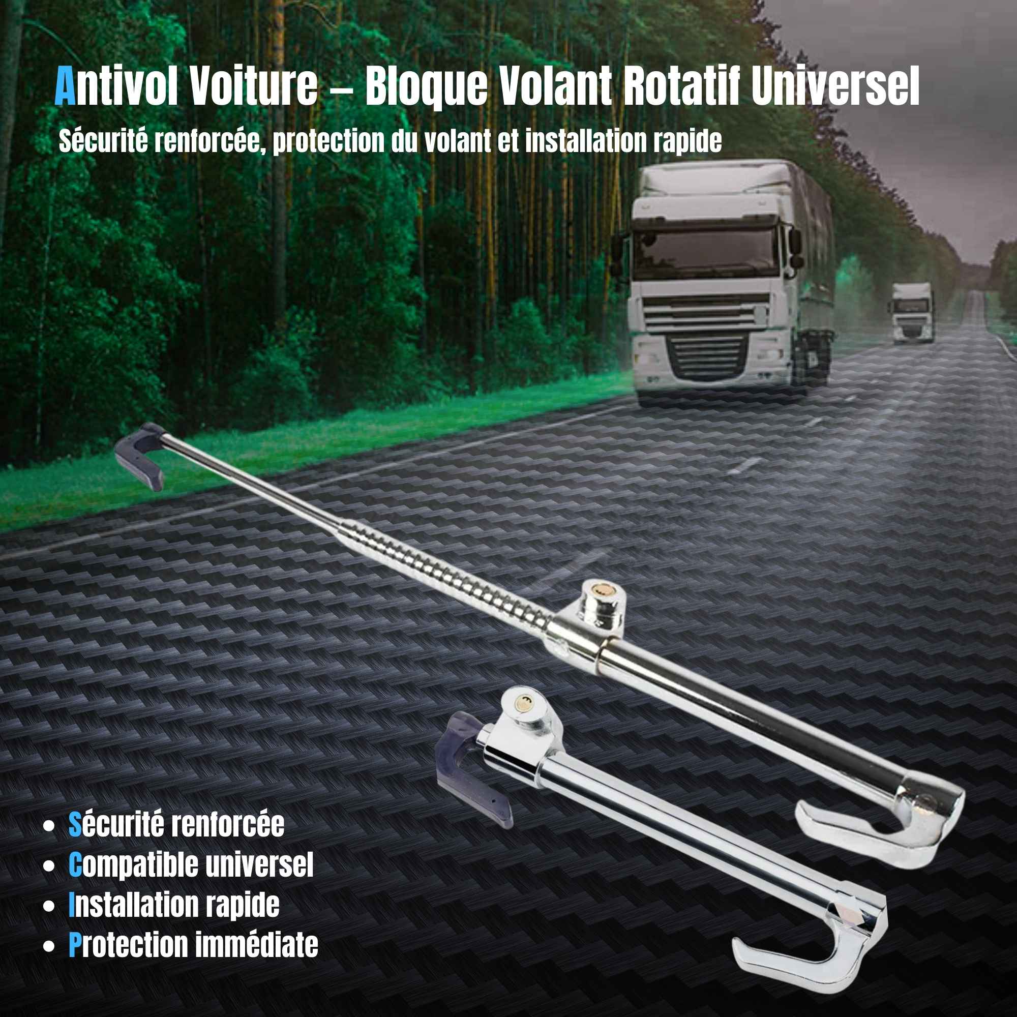 L'installation s'effectue par l'extension de la barre, le positionnement d'une extrémité sur la pédale de frein et de l'autre sur la jante du volant, suivi du verrouillage mécanique par clé.