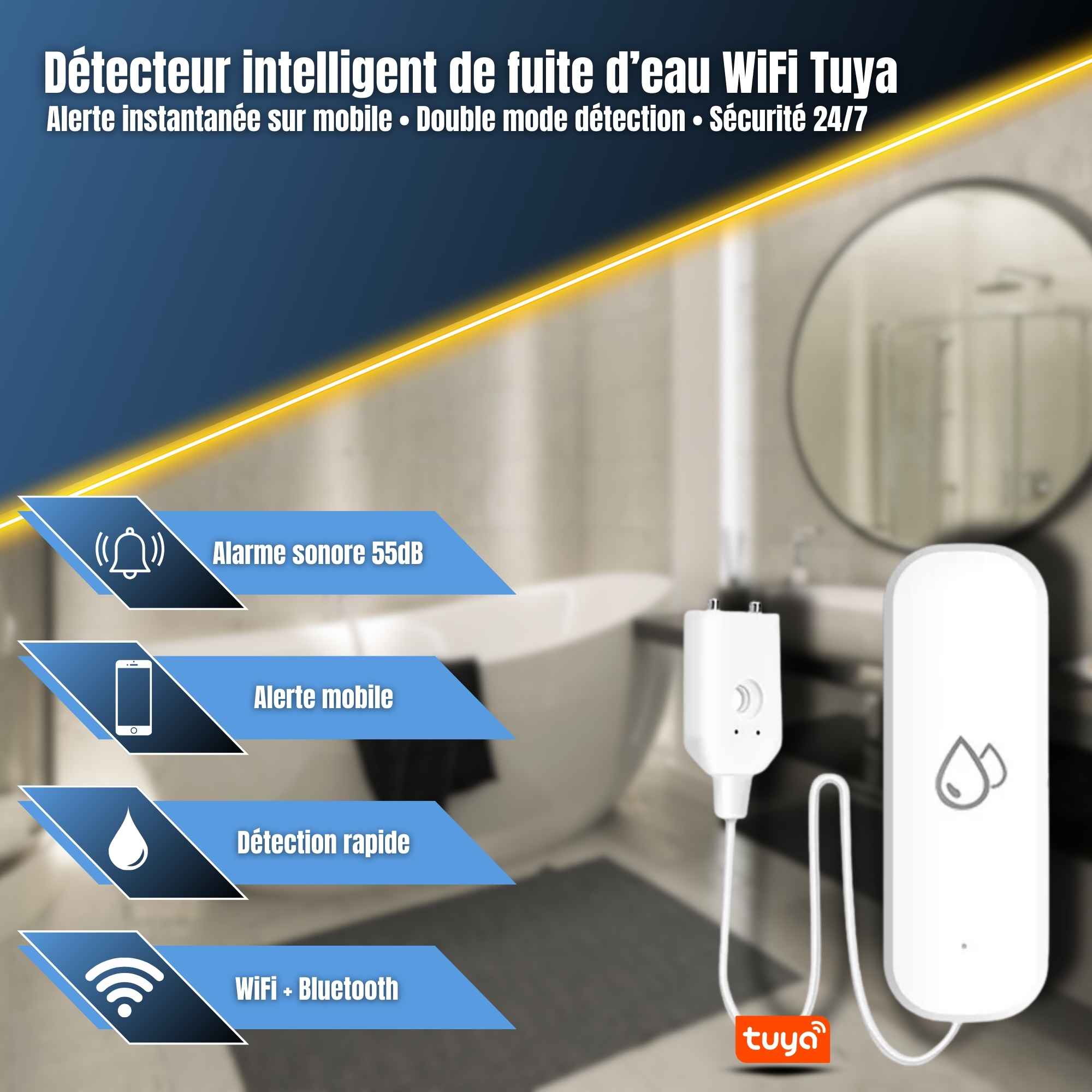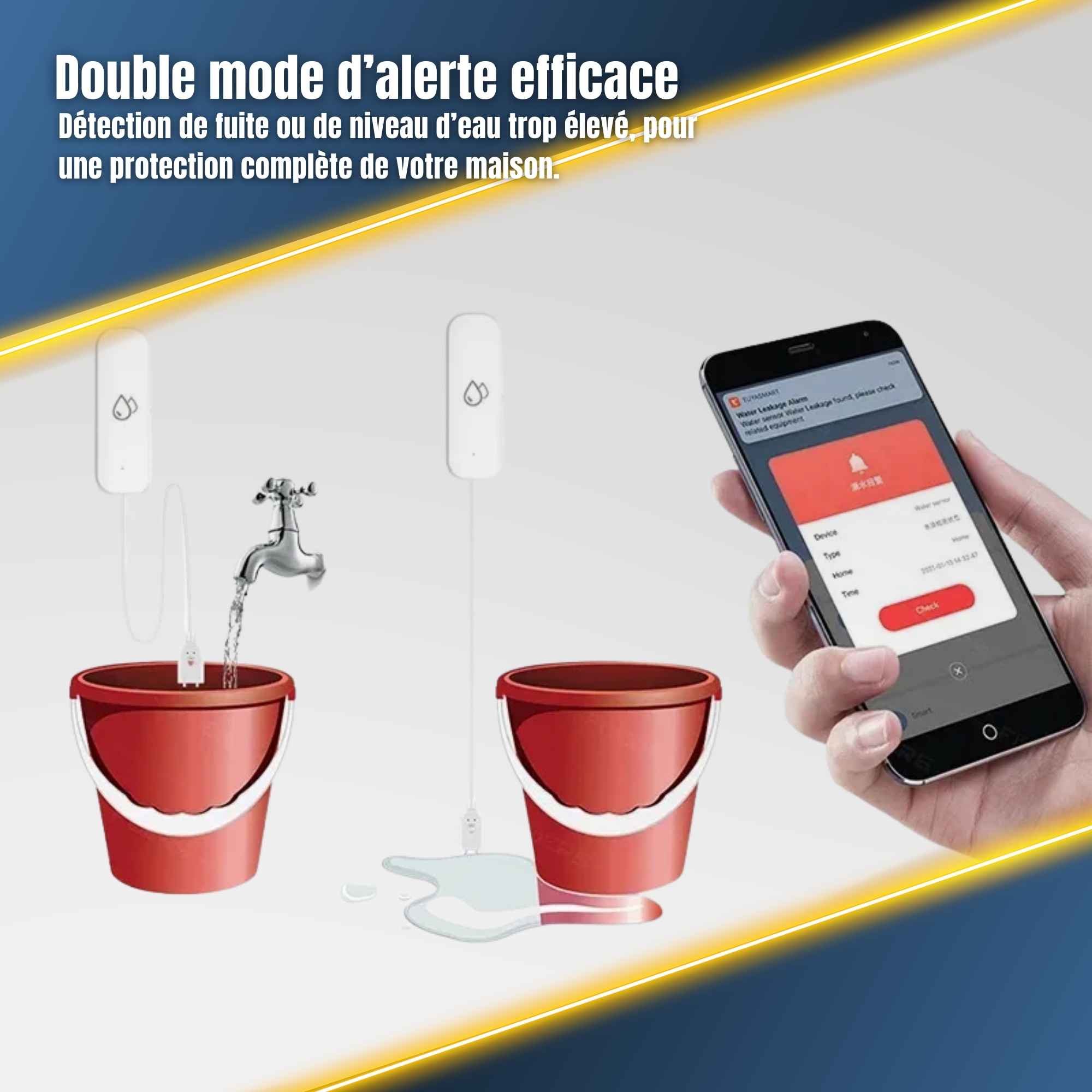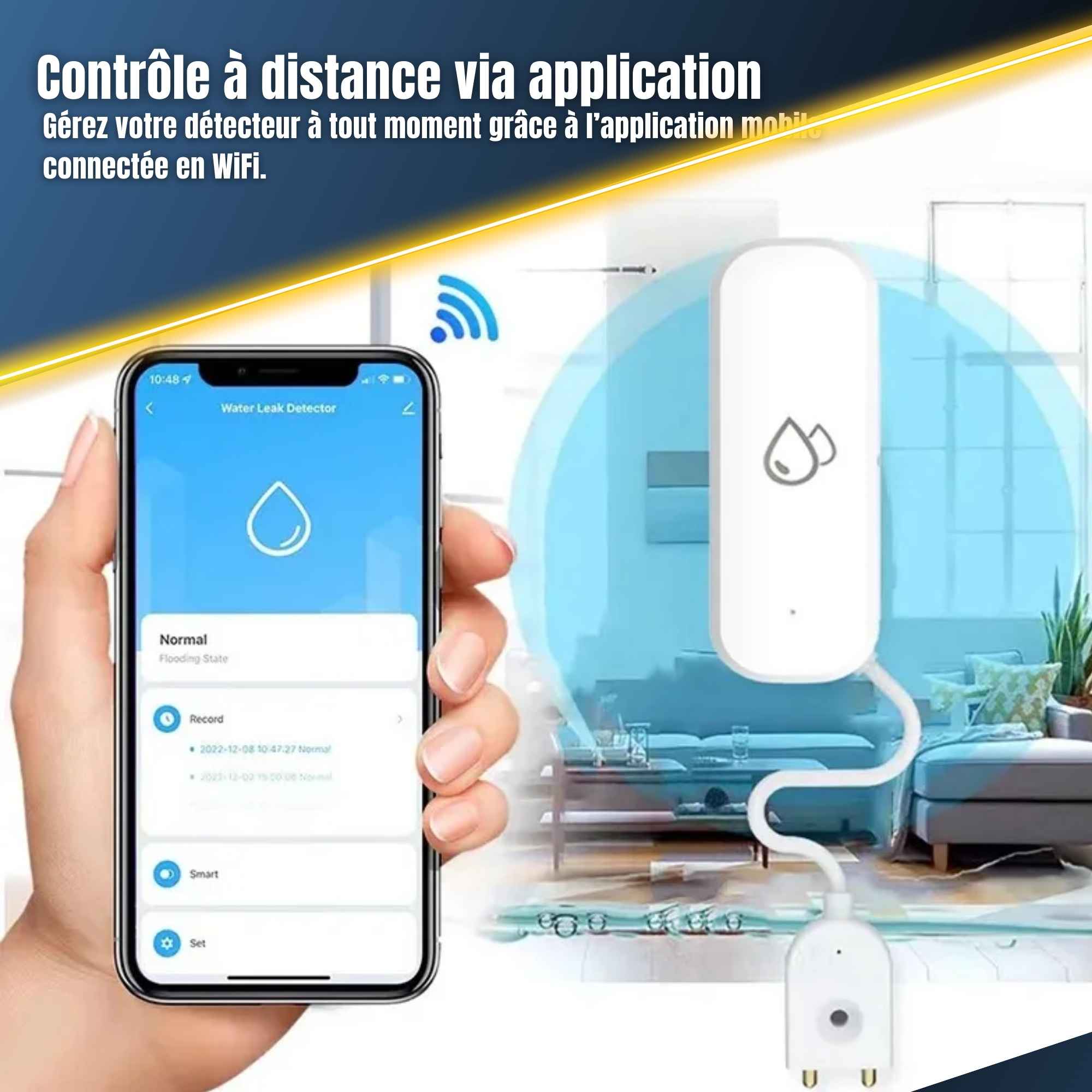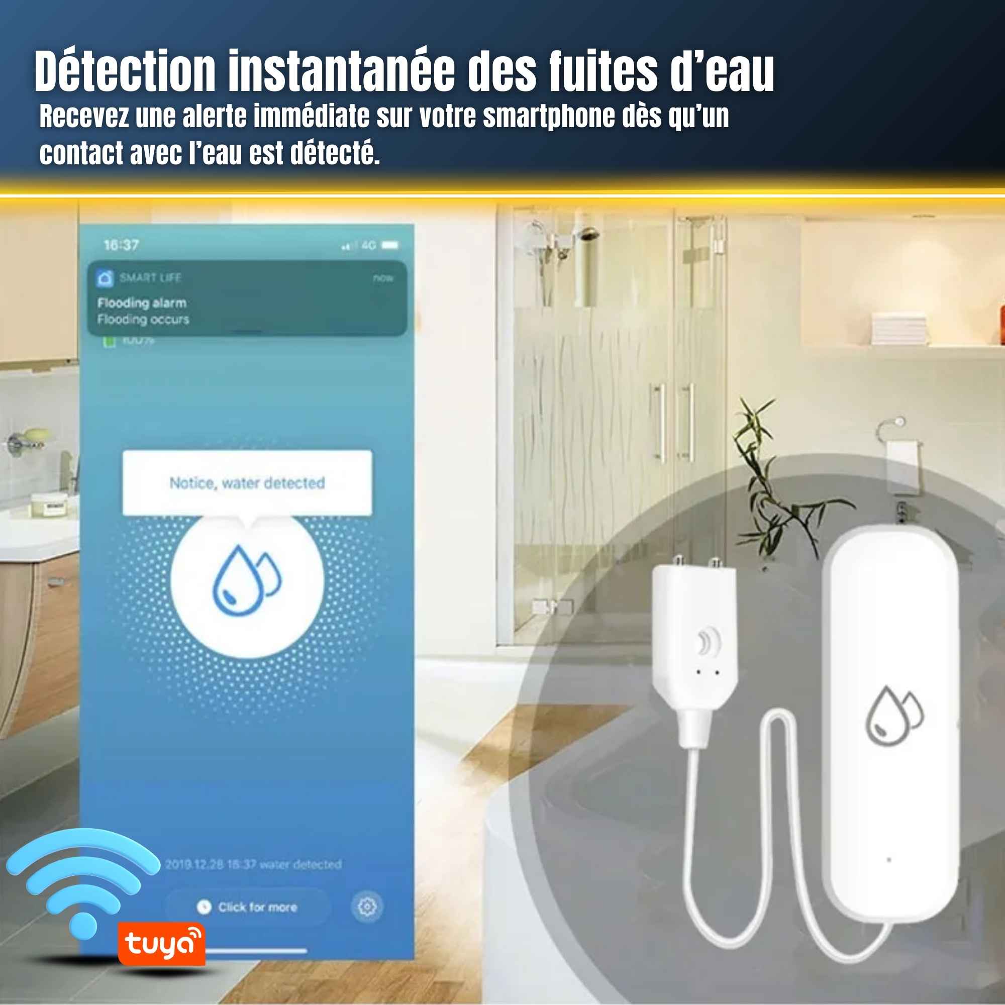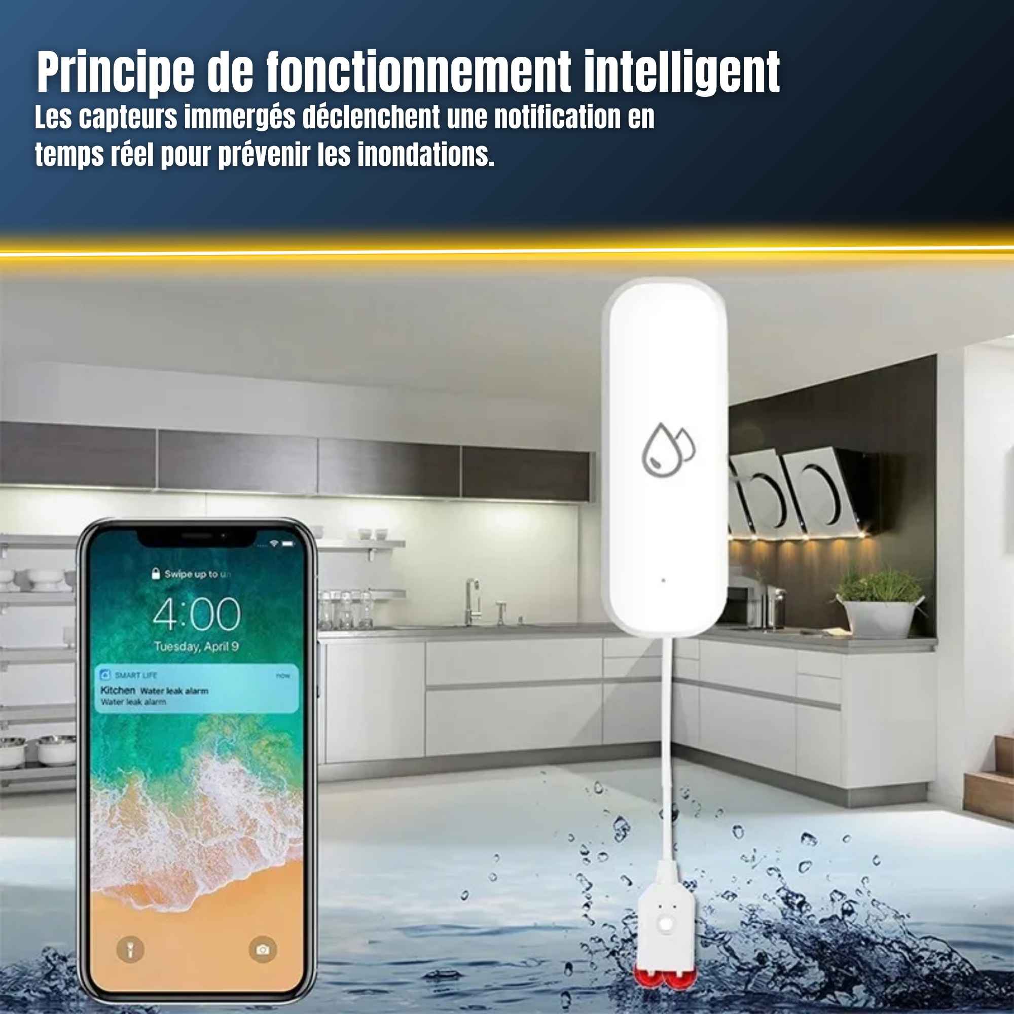 Le dispositif active immédiatement sa sirène locale et transmet une alerte sur votre smartphone via le réseau Wi-Fi pour vous informer du contact avec l'eau.
