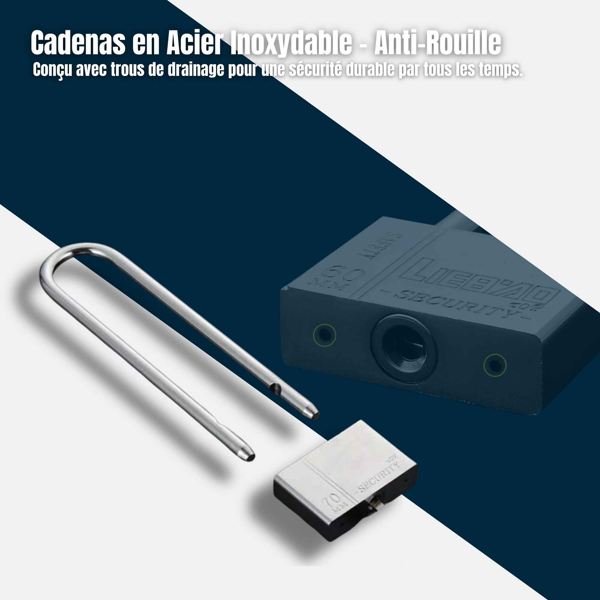 Équipé d’une anse longue en acier trempé, permettant le verrouillage sur des points de fixation éloignés ou des loquets larges. La composition de l’acier offre une résistance accrue aux contraintes mécaniques.