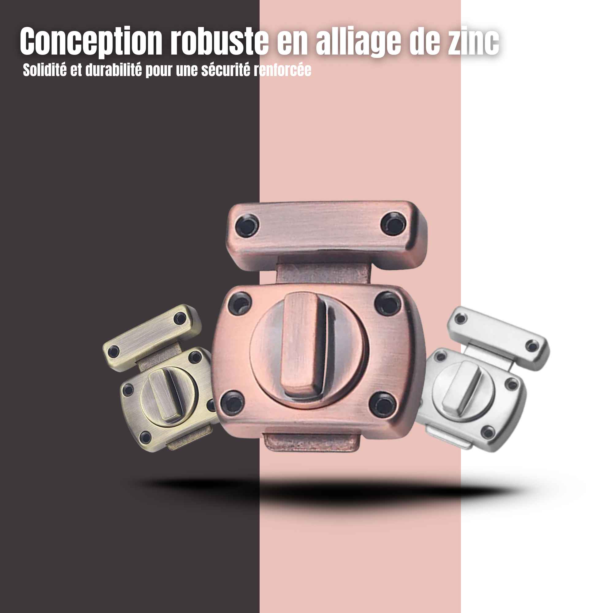 Verrou conçu en alliage de zinc haute densité. Ce matériau est sélectionné pour sa résistance mécanique, sa durabilité face à l’usure et sa rigidité structurelle.
