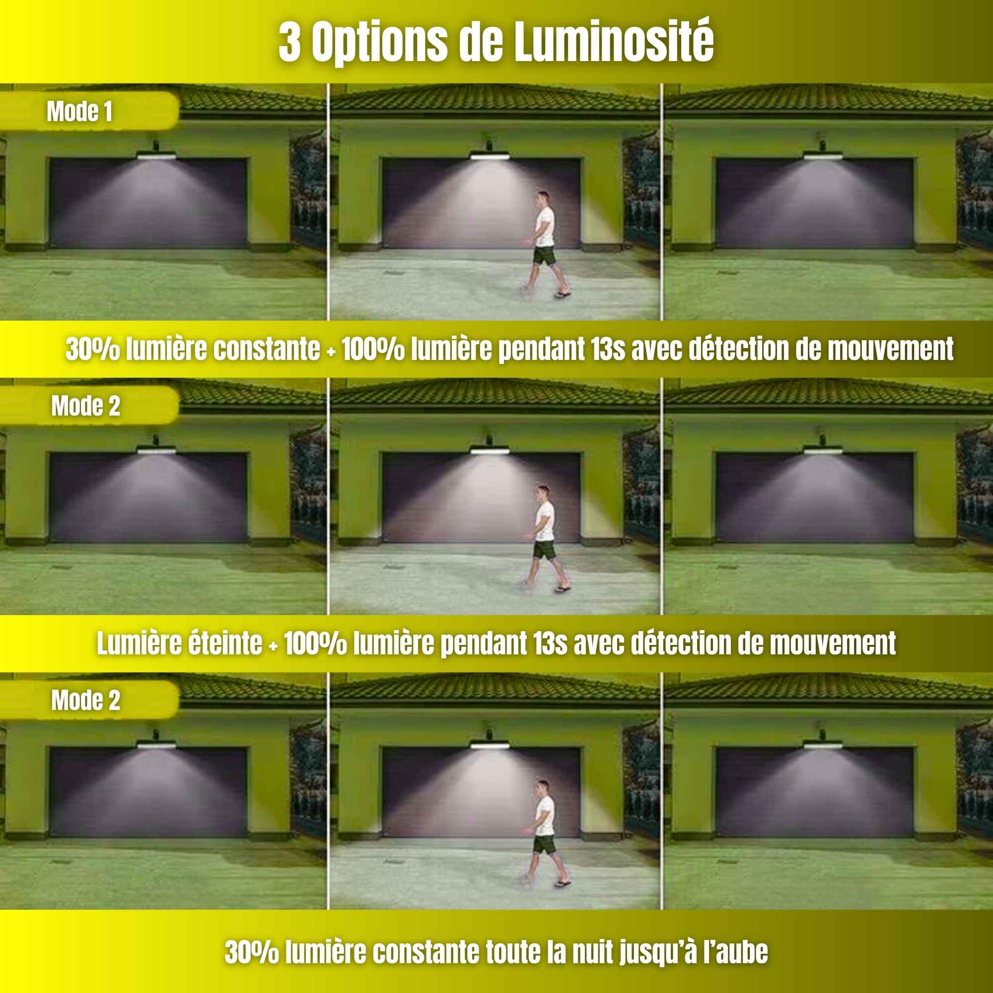 Le contrôleur propose 3 modes opératoires : activation par capteur avec veilleuse résiduelle, activation haute intensité sur détection, ou flux continu basse intensité constant.