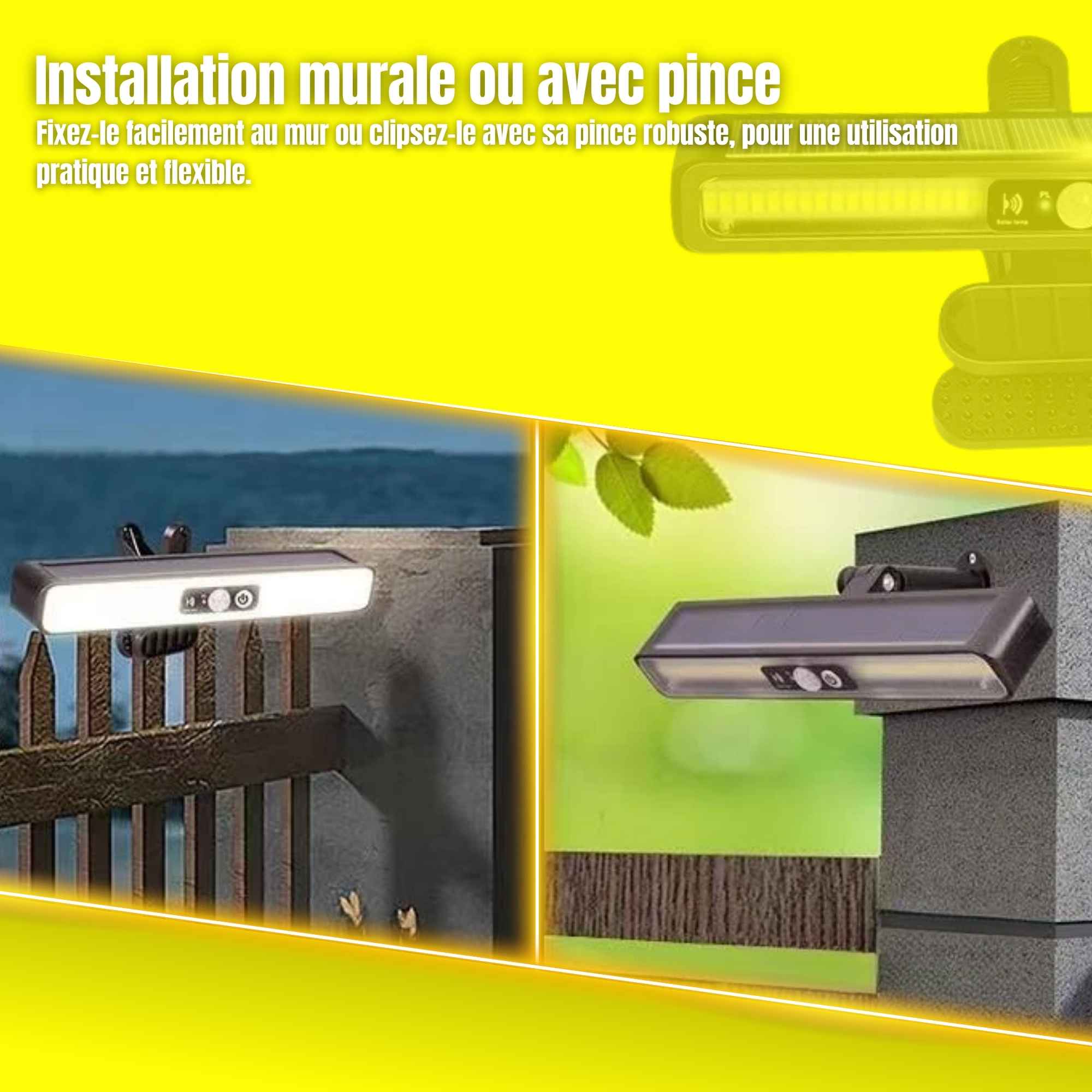 Système d’installation flexible permettant un montage mural classique ou une fixation par pince robuste. S’adapte facilement à différents supports pour un éclairage ciblé et amovible.