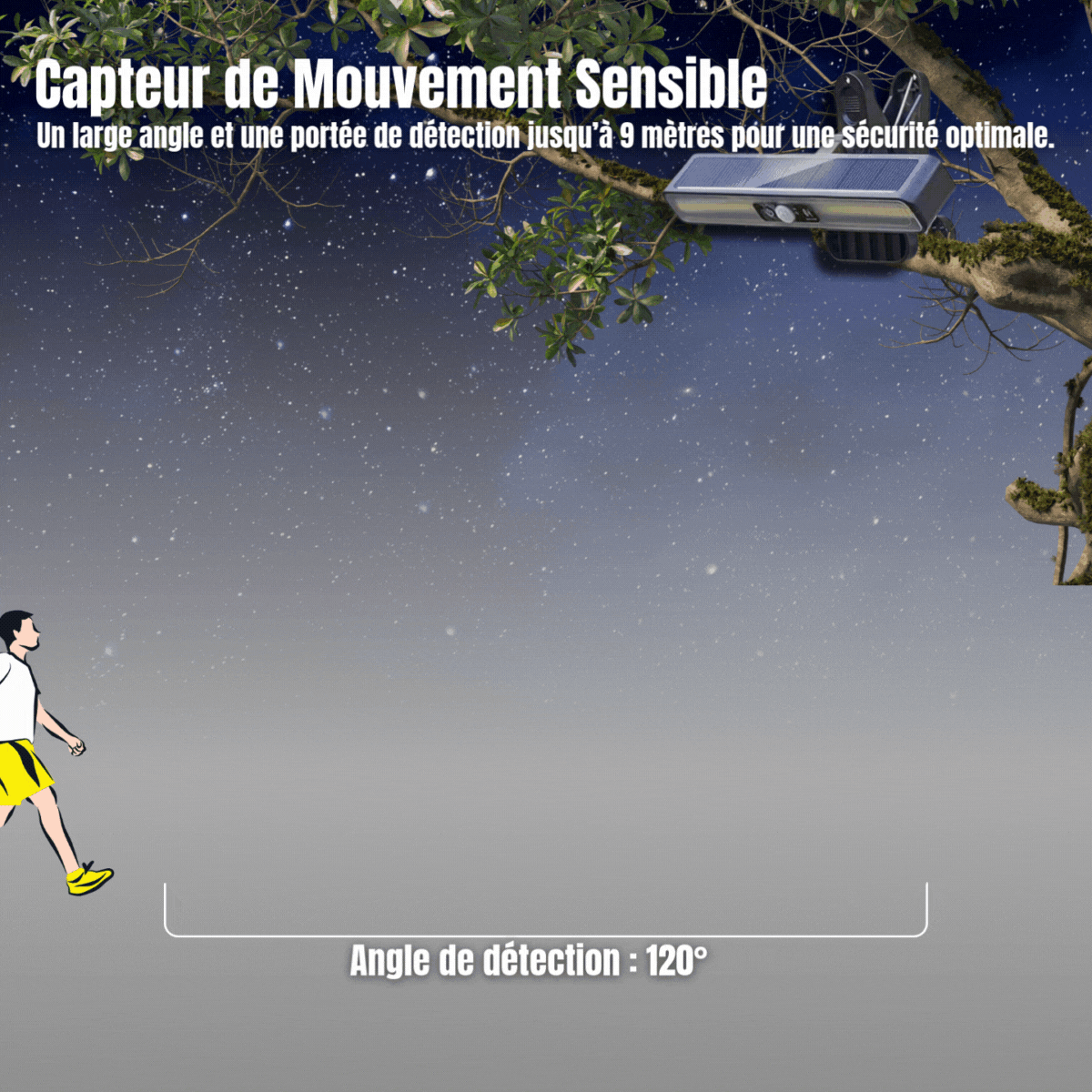 Le capteur infrarouge passif (PIR) possède un angle de balayage de 120°. Il permet une activation automatique lors d'une détection de présence dans un rayon allant jusqu'à 8 mètres (26 pieds).
