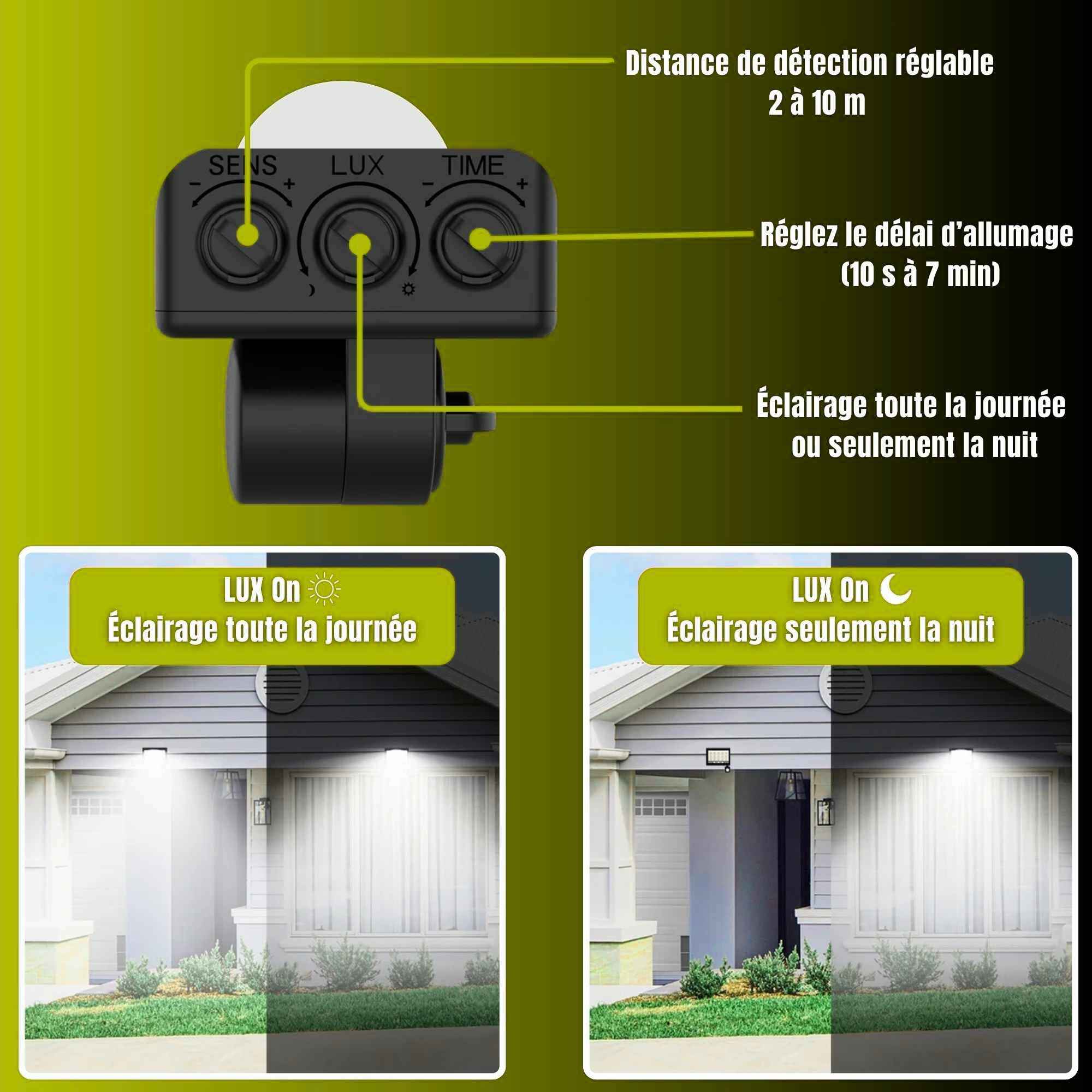 Réglages intégrés permettant de définir avec précision la portée de détection et la temporisation de l’allumage, offrant une gestion personnalisée et une ergonomie d’utilisation.