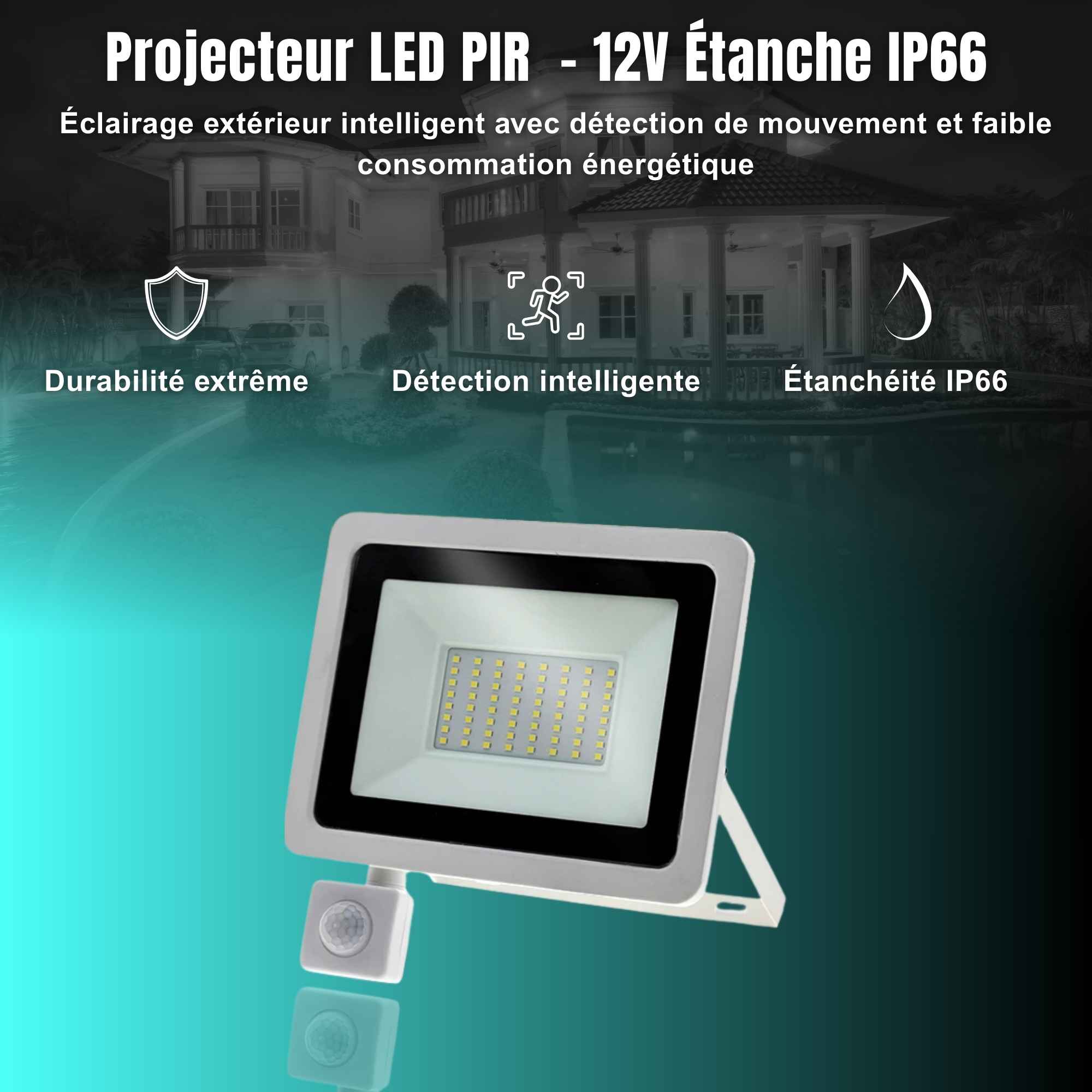 Le projecteur utilise un capteur infrarouge passif (PIR) offrant une portée de détection de 2 à 12 mètres sur un angle de 180°. La temporisation est ajustable de 8 secondes à 10 minutes.