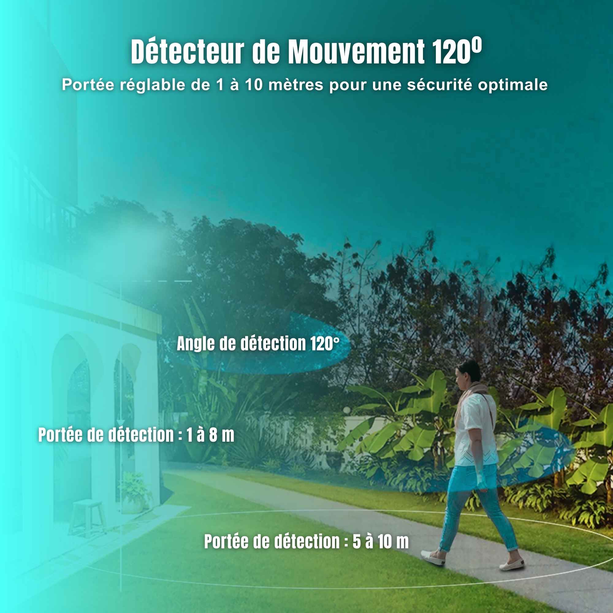 Capteur à large champ angulaire avec réglages de précision, permettant de définir un périmètre d’activation personnalisé pour une gestion optimale des zones extérieures.