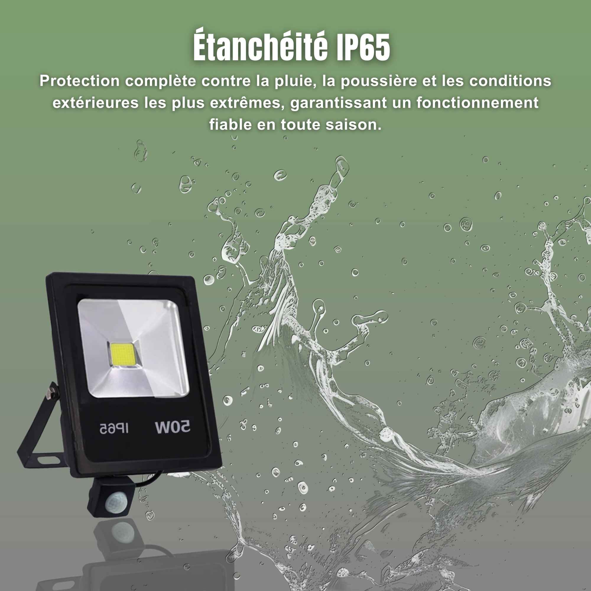 Le projecteur privilégie l'efficacité énergétique, offre une intensité lumineuse élevée et présente un châssis robuste adapté aux zones logistiques, périmètres industriels ou façades.