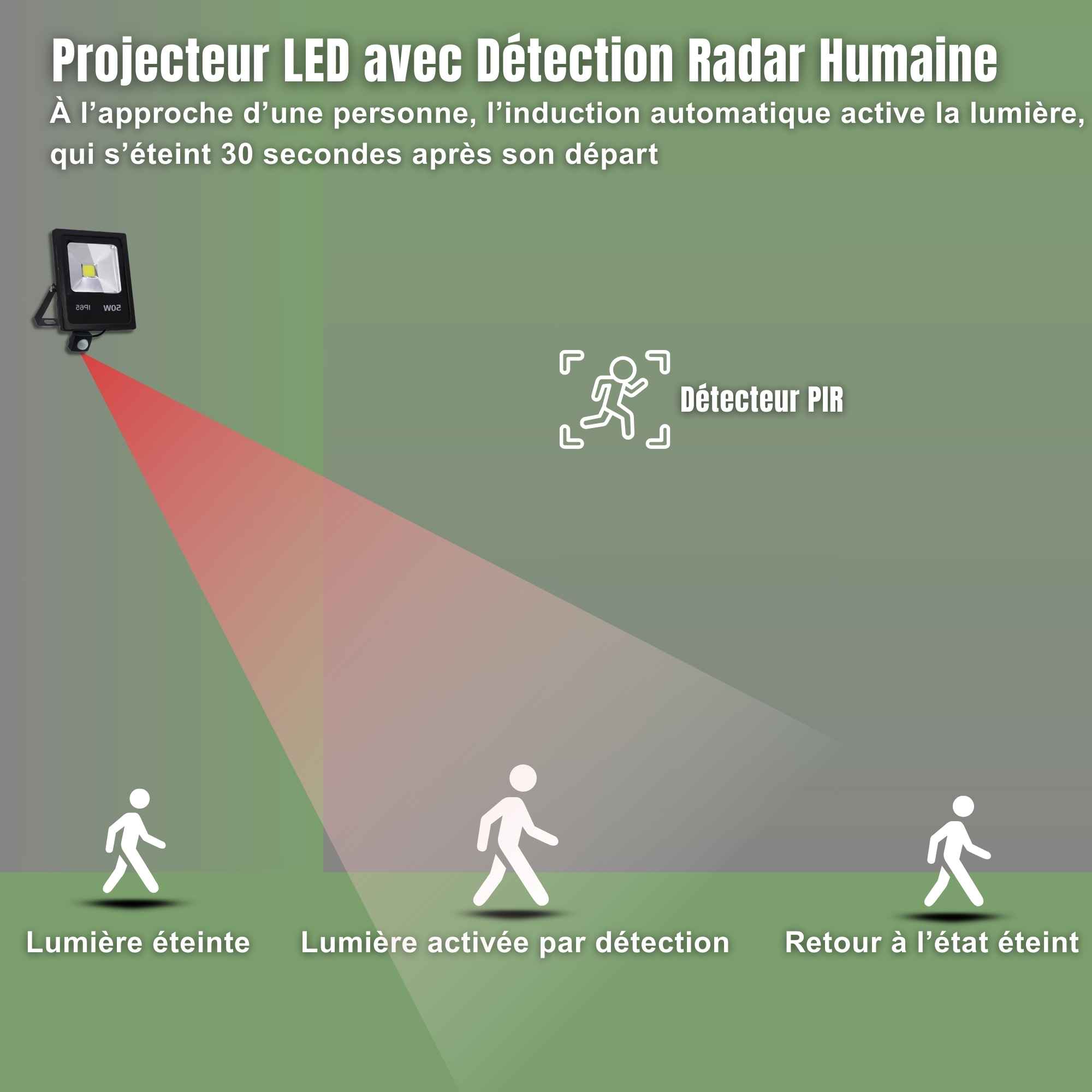 Système d’éclairage réactif équipé d’une technologie de détection de mouvement, conçu pour l’activation automatique du flux lumineux lors d’un passage dans la zone de couverture.