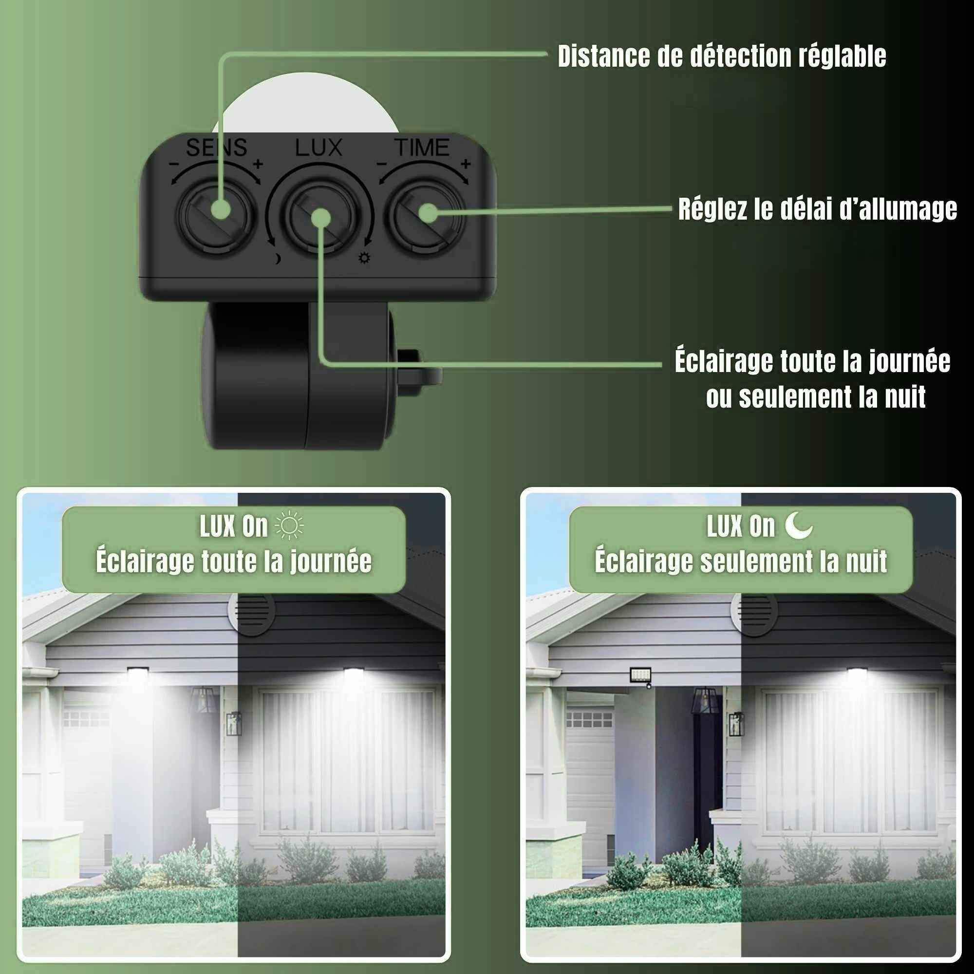 Réglages intégrés permettant de définir la portée de détection et la temporisation de l’éclairage, optimisant ainsi la consommation énergétique selon les besoins spécifiques du périmètre.