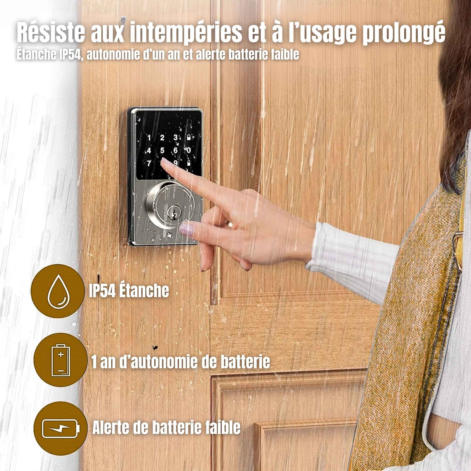 La serrure est alimentée par piles, ce qui facilite son fonctionnement sans raccordement électrique filaire.