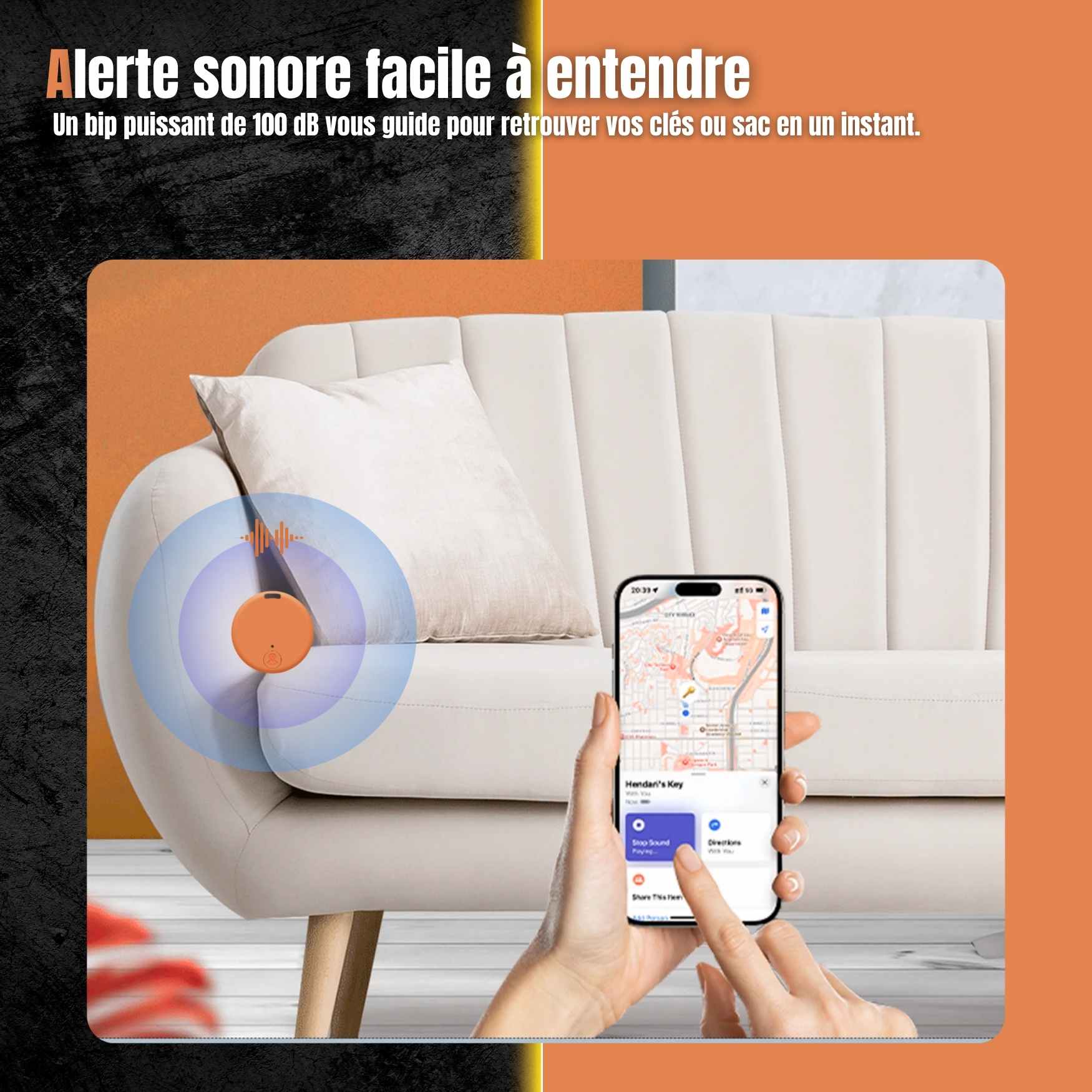 Émetteur sonore haute fréquence délivrant un signal de 100 dB, conçu pour l’identification auditive de l’emplacement de l’objet à proximité immédiate.