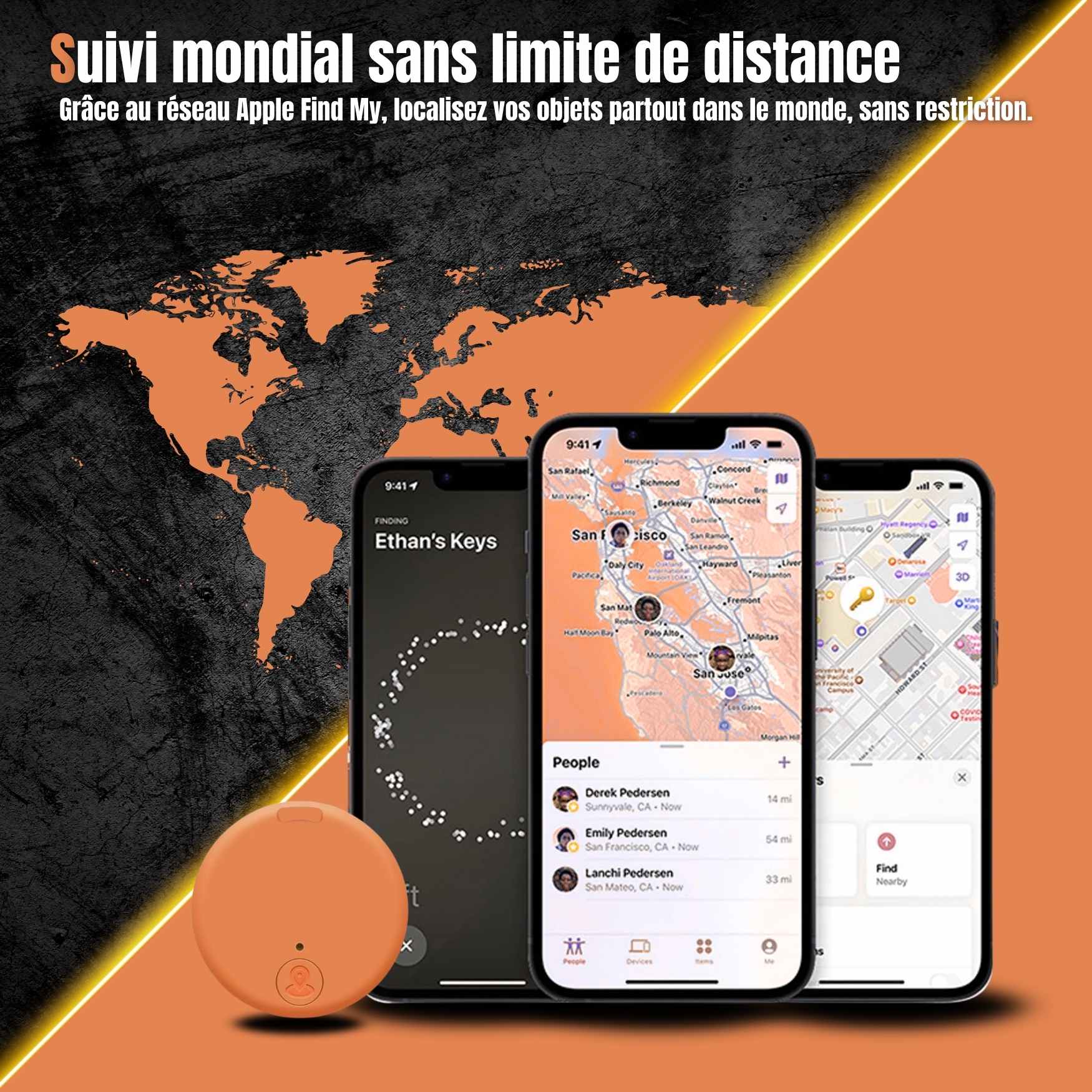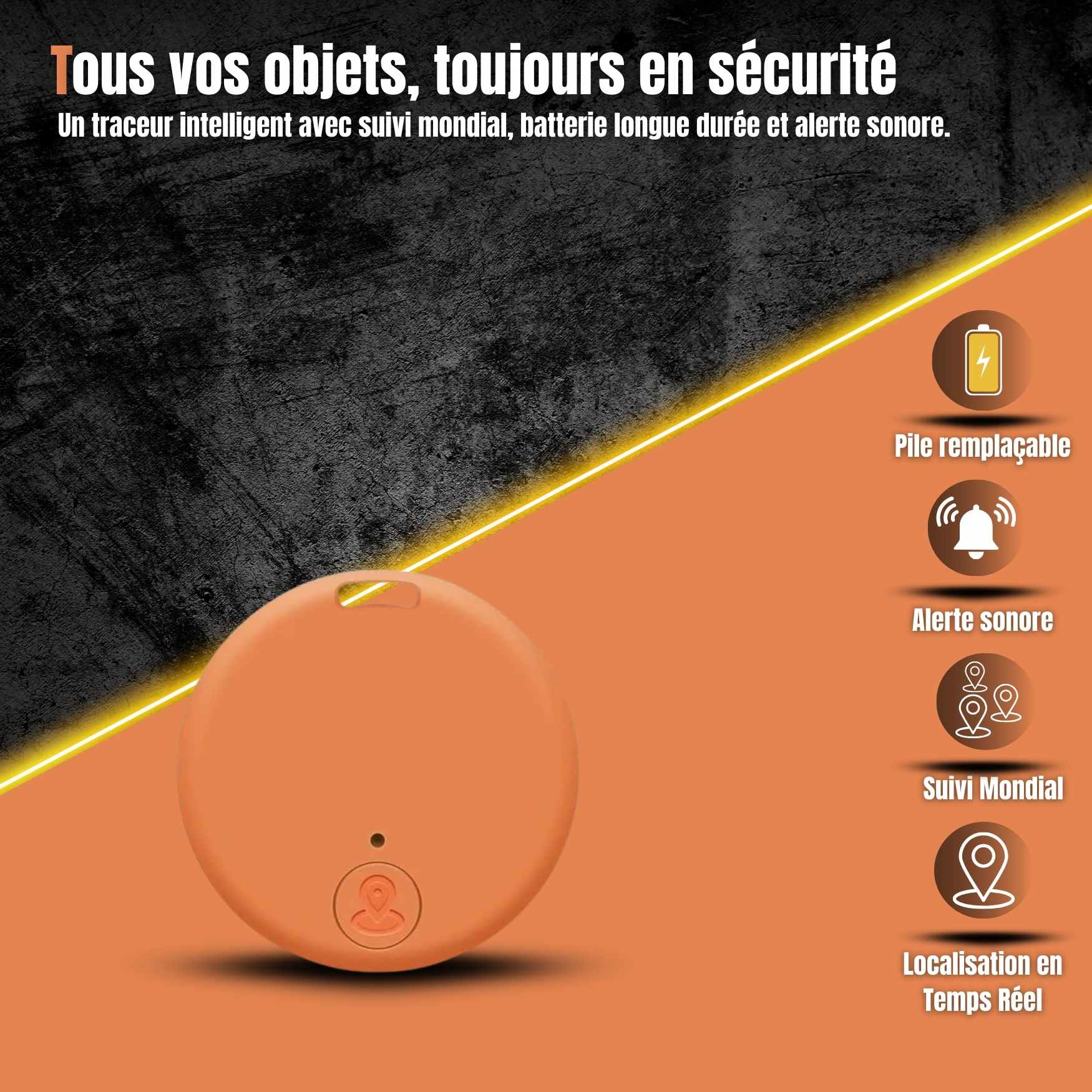 Le dispositif est conçu pour être fixé sur divers accessoires personnels tels que des trousseaux de clés, des bagages ou des portefeuilles, afin de faciliter leur localisation en cas d'égarement.